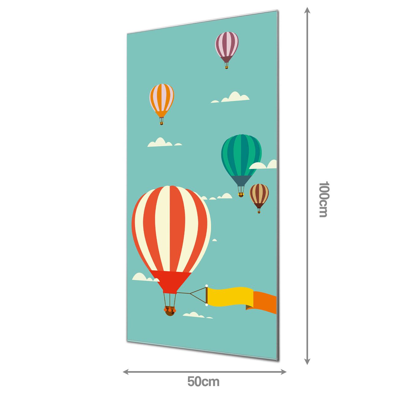 Material  4mm Sicherheitsglas mit Metallrückwand Eigenschaften  farbbrillant, kratzfest, rahmenlos Maße  50x100x0,6cm, 7,50 kg schwer Motiv  Nummer 11362 Vier Ballons