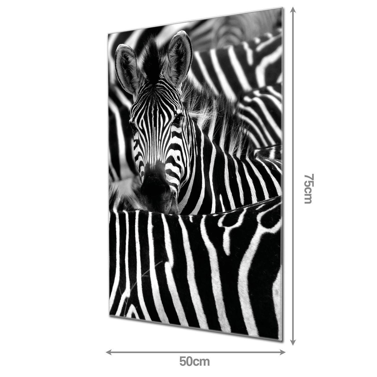 Material  4mm Sicherheitsglas mit Metallrückwand Eigenschaften  farbbrillant, kratzfest, rahmenlos Maße  50x75x0,6cm, 5,63 kg schwer Motiv  Nummer 11354 Zebras
