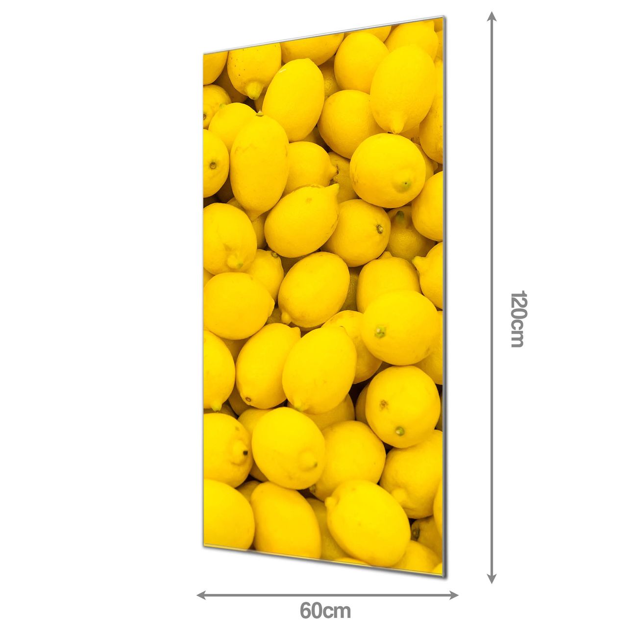 Material  4mm Sicherheitsglas mit Metallrückwand Eigenschaften  farbbrillant, kratzfest, rahmenlos Maße  60x120x0,6cm, 10,80 kg schwer Motiv  Nummer 11662 Zitronen