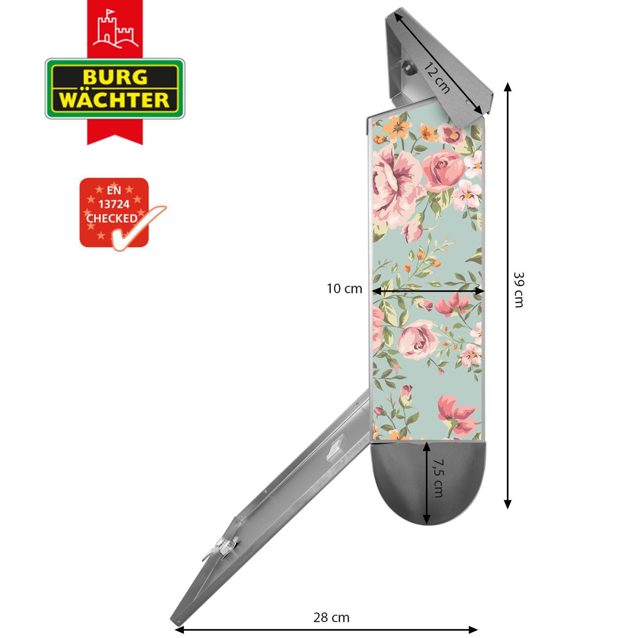 Der BURG-WÄCHTER Edelstahl Briefkasten mit Motiv Altrosa Blume und Zeitungsrolle bietet Ihnen mit seinem Fassungsvermögen genügend Platz auch für große A4 Sendungen und Zeitschriften. Das integrierte Regendach schützt Ihre Post vor dem Eindringen von Regen.