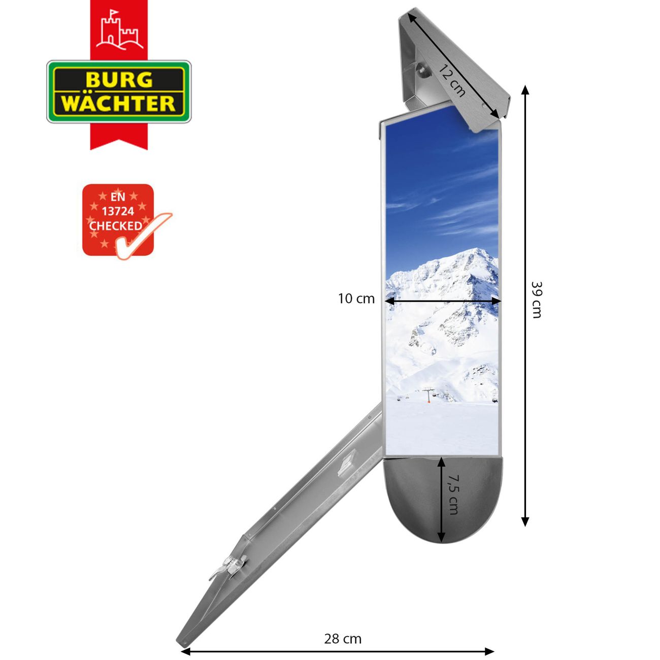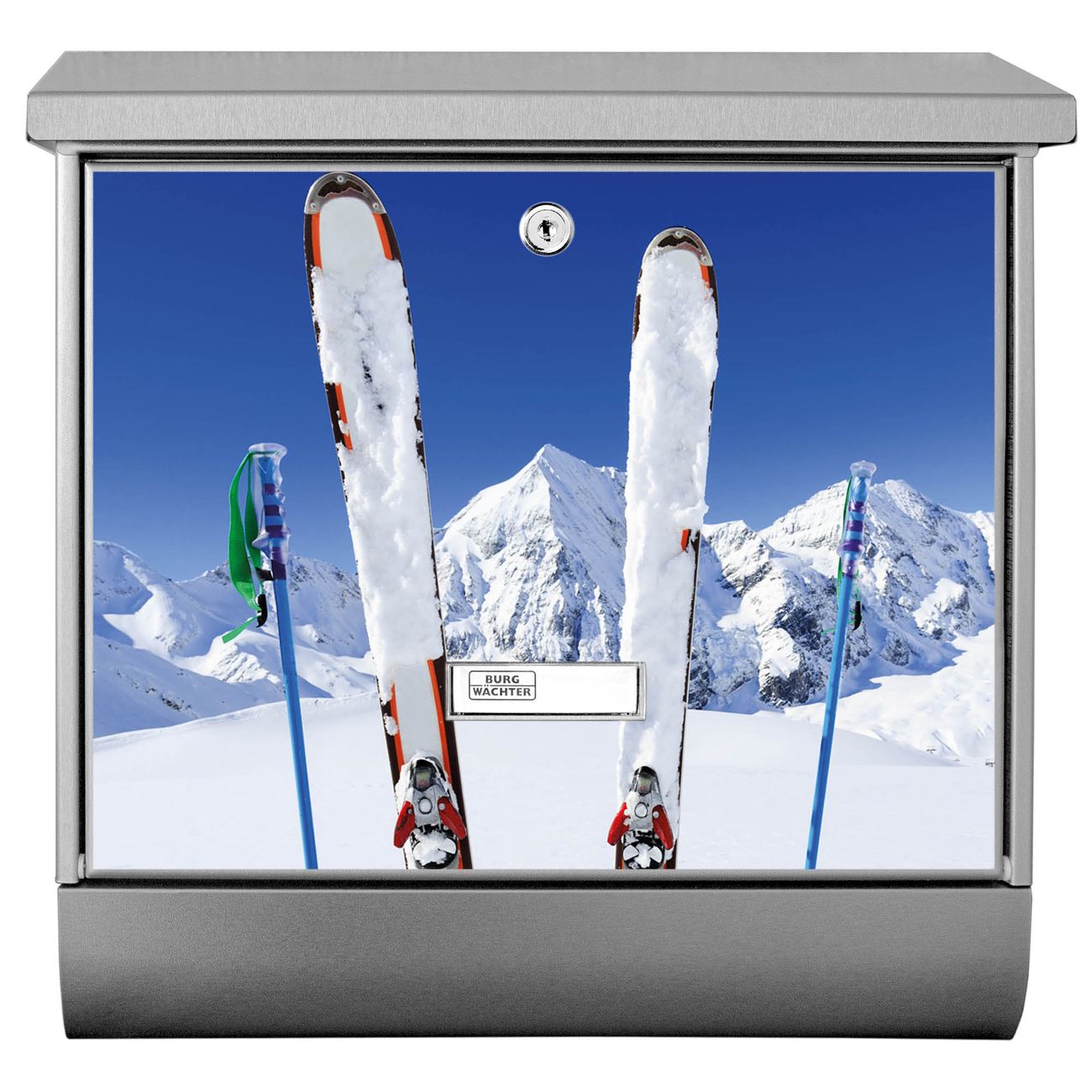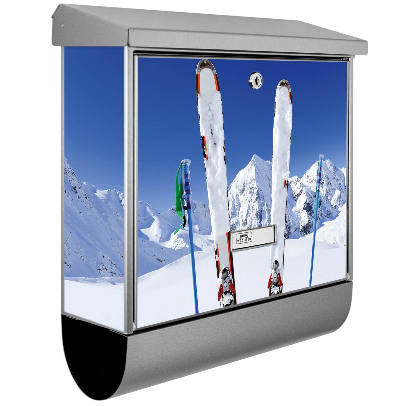 Der BURG-WÄCHTER Edelstahl Briefkasten mit Motiv Apres Ski und Zeitungsrolle bietet Ihnen mit seinem Fassungsvermögen genügend Platz auch für große A4 Sendungen und Zeitschriften. Das integrierte Regendach schützt Ihre Post vor dem Eindringen von Regen.
