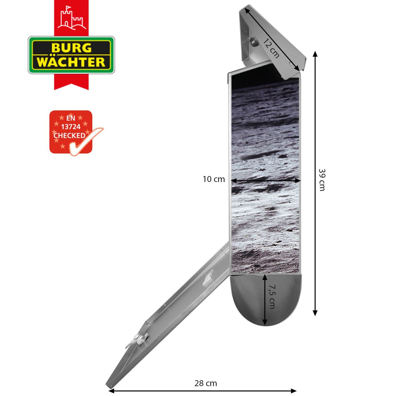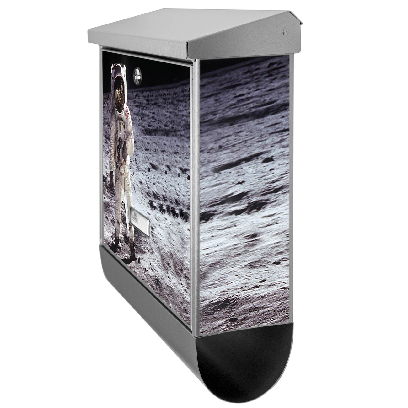 Der BURG-WÄCHTER Edelstahl Briefkasten mit Motiv Astronaut und Zeitungsrolle bietet Ihnen mit seinem Fassungsvermögen genügend Platz auch für große A4 Sendungen und Zeitschriften. Das integrierte Regendach schützt Ihre Post vor dem Eindringen von Regen.