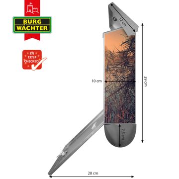 Der BURG-WÄCHTER Edelstahl Briefkasten mit Motiv Bank Am See und Zeitungsrolle bietet Ihnen mit seinem Fassungsvermögen genügend Platz auch für große A4 Sendungen und Zeitschriften. Das integrierte Regendach schützt Ihre Post vor dem Eindringen von Regen.