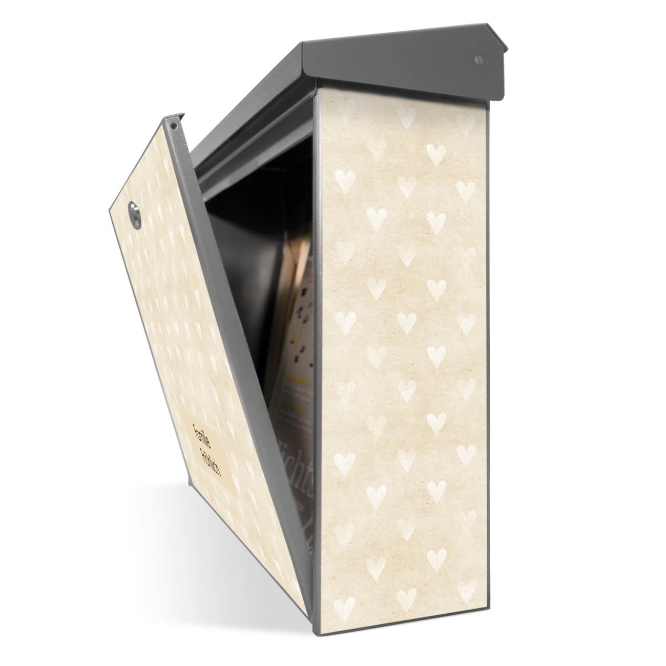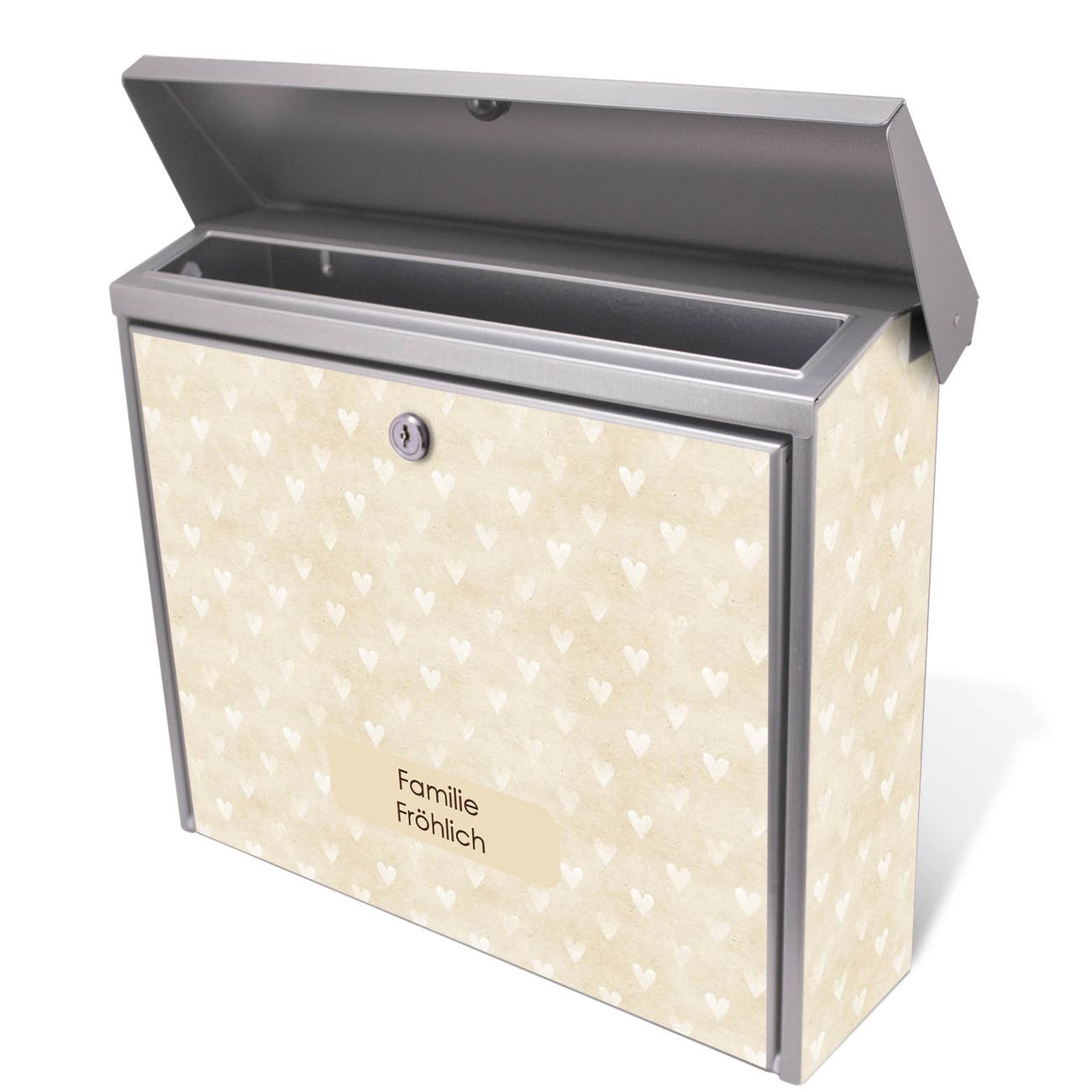 Der Postkasten mit Beige Herzen Motiv hat ein sehr ansprechendes und zeitloses Design. Unsere Motivpalette hält jede Menge Varianten bereit, ob klassisch, modern, verspielt oder witzig - für jeden haben wir das passende Motiv parat. Der Briefkasten ist das Aushängeschild Ihres Hauses.