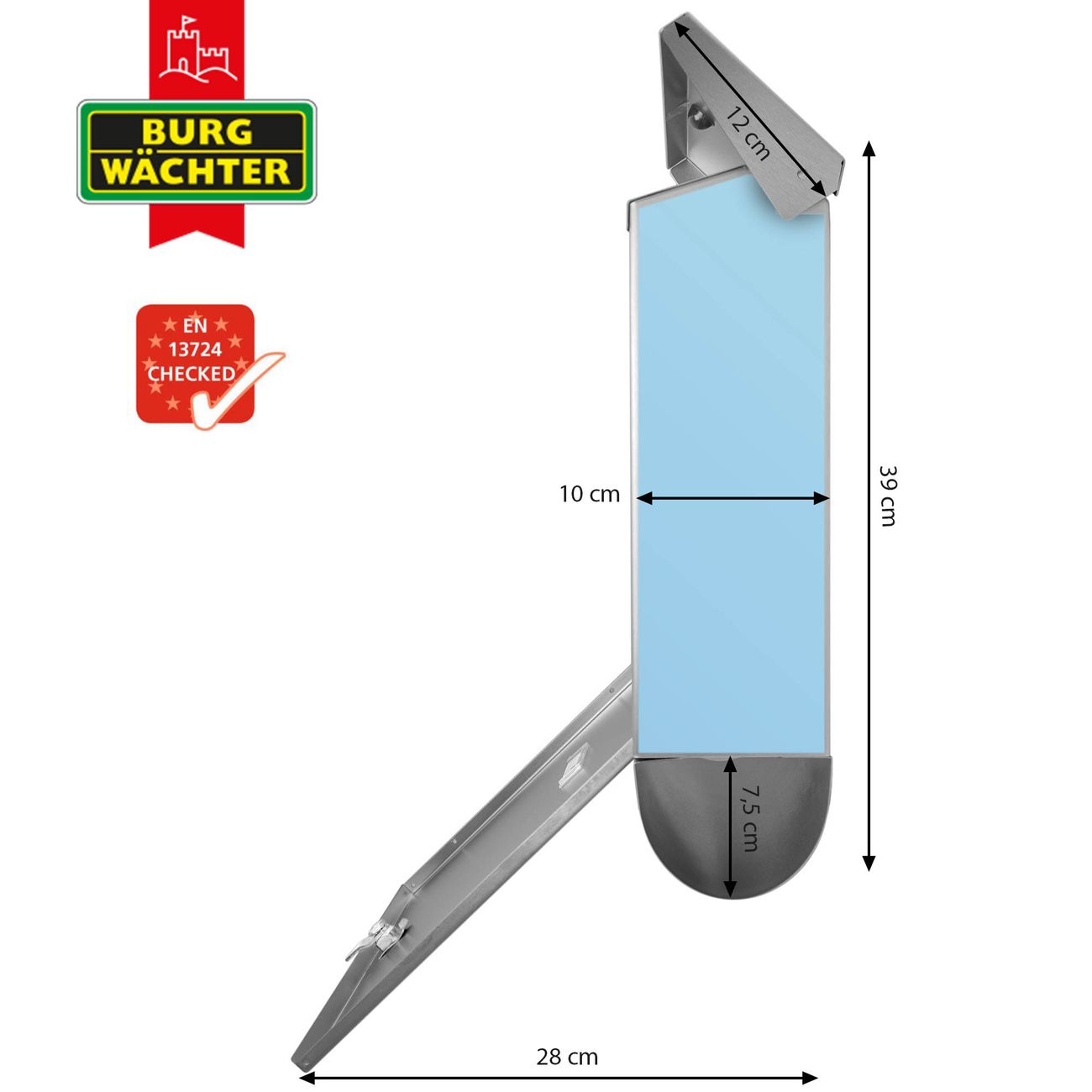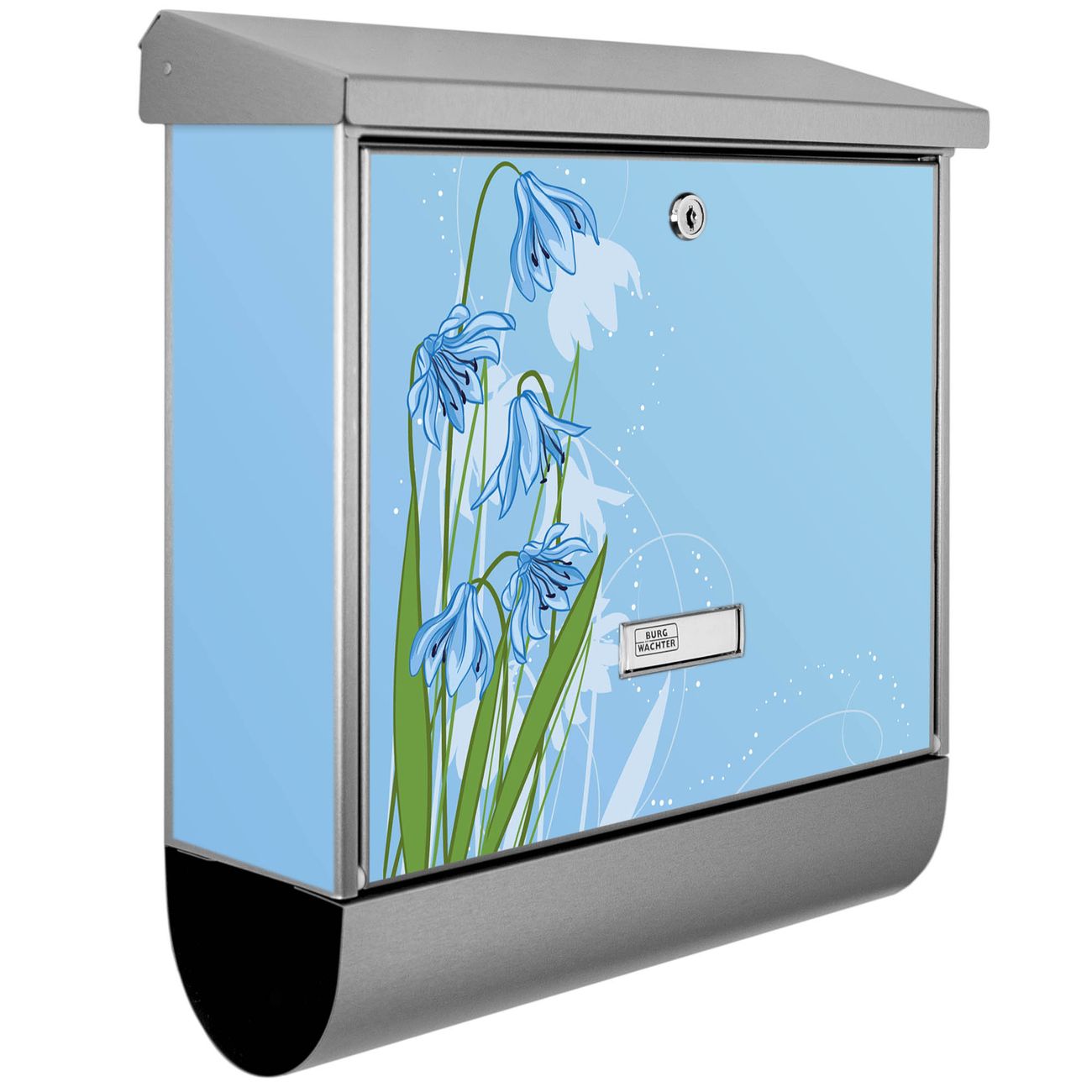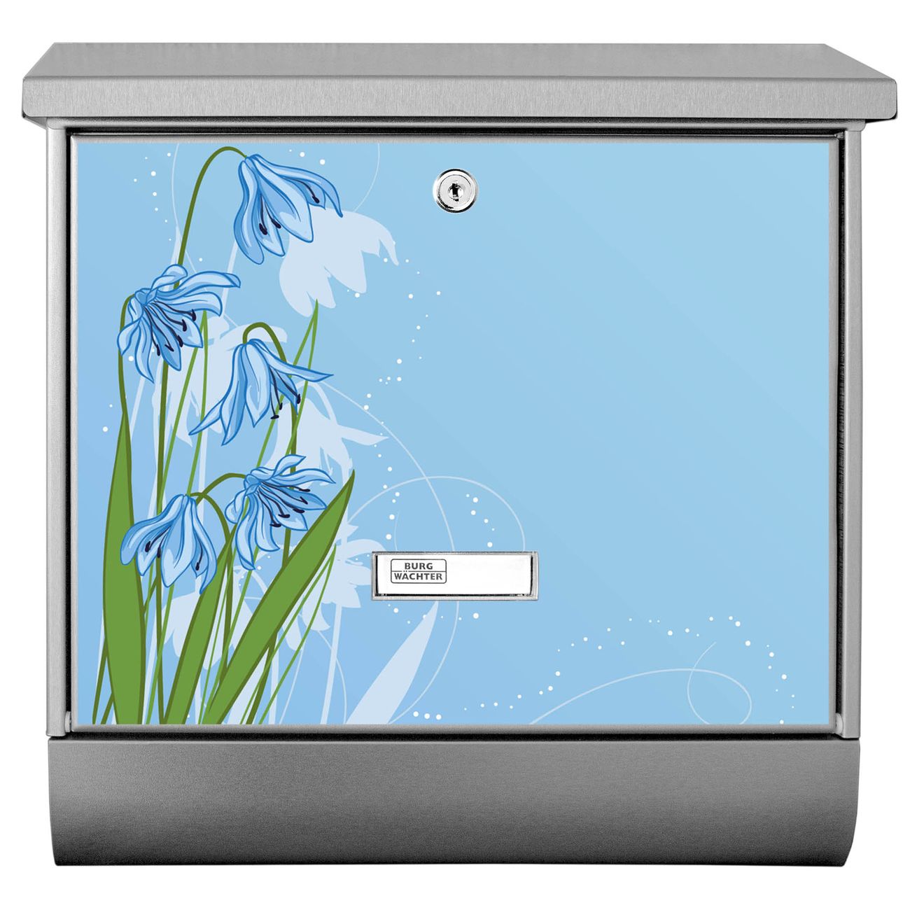 Der BURG-WÄCHTER Edelstahl Briefkasten mit Motiv Bergblaulilie und Zeitungsrolle bietet Ihnen mit seinem Fassungsvermögen genügend Platz auch für große A4 Sendungen und Zeitschriften. Das integrierte Regendach schützt Ihre Post vor dem Eindringen von Regen.