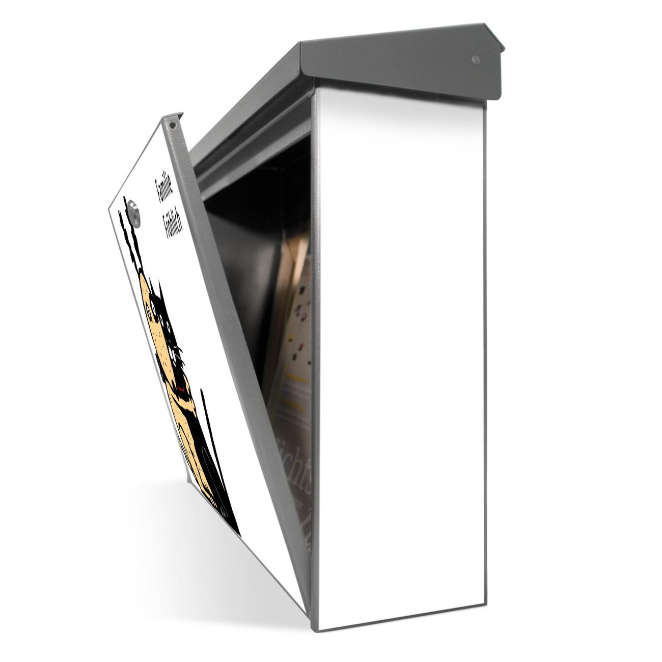 Der Briefkasten besteht aus Edelstahl, einem hochwertigen Material das witterungsbeständig ist. Das Motiv besteht aus einer wetter- und UV-festen Folie, die Ihren Briefkasten zusätzlich vor Kratzern schützt. Der Postkasten ist 31,5cm hoch, 38,5cm breit und 12cm tief. Der Briefeinwurf ist 33,2cm x 2,7cm, Format DIN C4. Der Briefkasten wird mit Montagematerial und zwei Schlüsseln geliefert.