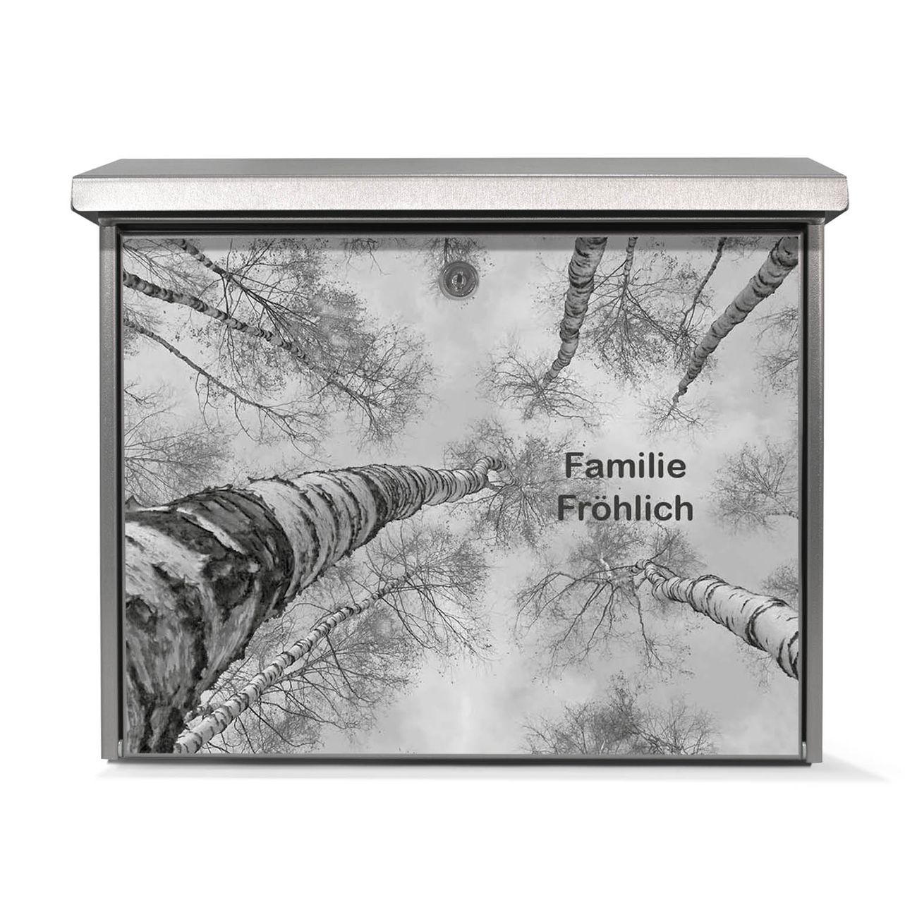 Der Postkasten mit Birkenwald Motiv hat ein sehr ansprechendes und zeitloses Design. Unsere Motivpalette hält jede Menge Varianten bereit, ob klassisch, modern, verspielt oder witzig - für jeden haben wir das passende Motiv parat. Der Briefkasten ist das Aushängeschild Ihres Hauses.