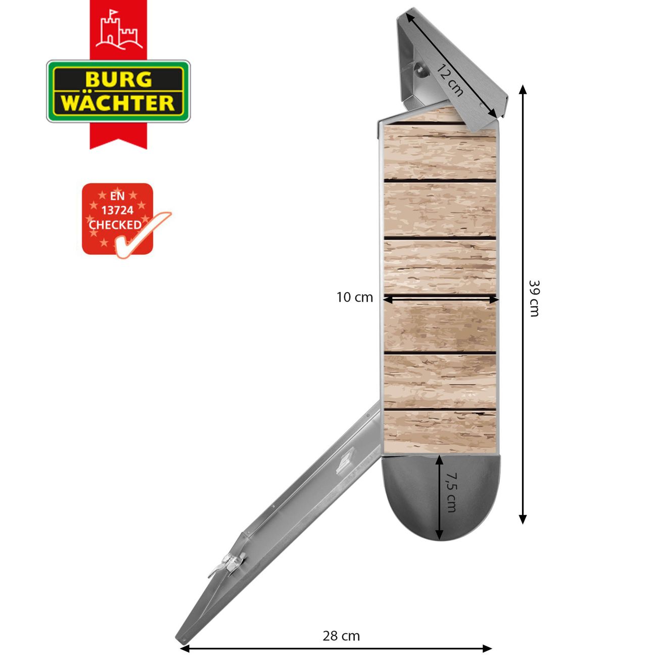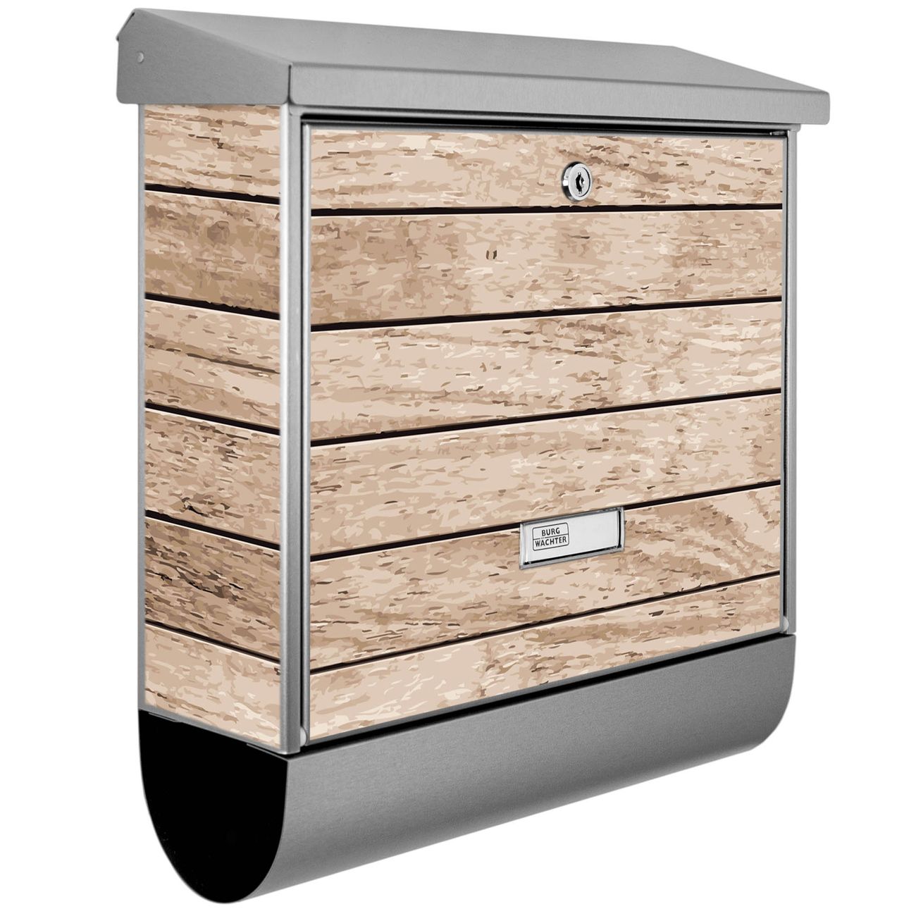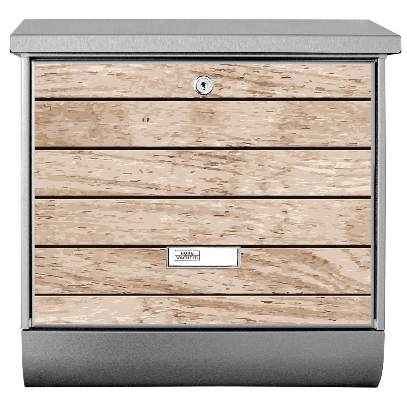 Der BURG-WÄCHTER Edelstahl Briefkasten mit Motiv Blasse Holzlatten und Zeitungsrolle bietet Ihnen mit seinem Fassungsvermögen genügend Platz auch für große A4 Sendungen und Zeitschriften. Das integrierte Regendach schützt Ihre Post vor dem Eindringen von Regen.