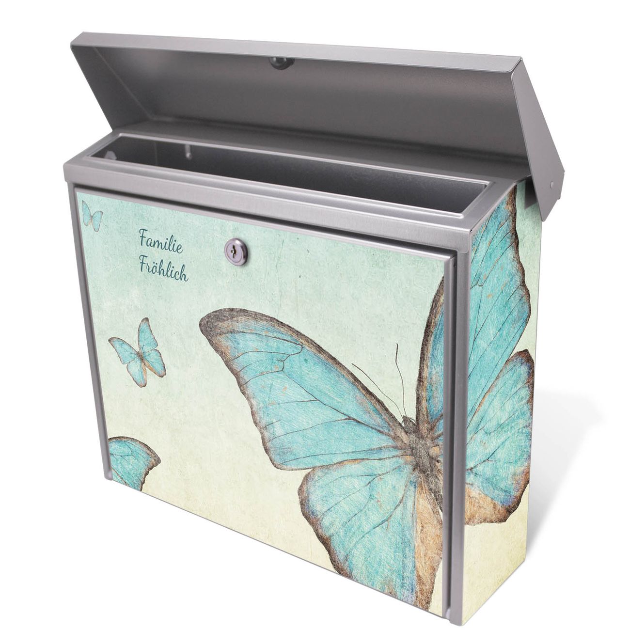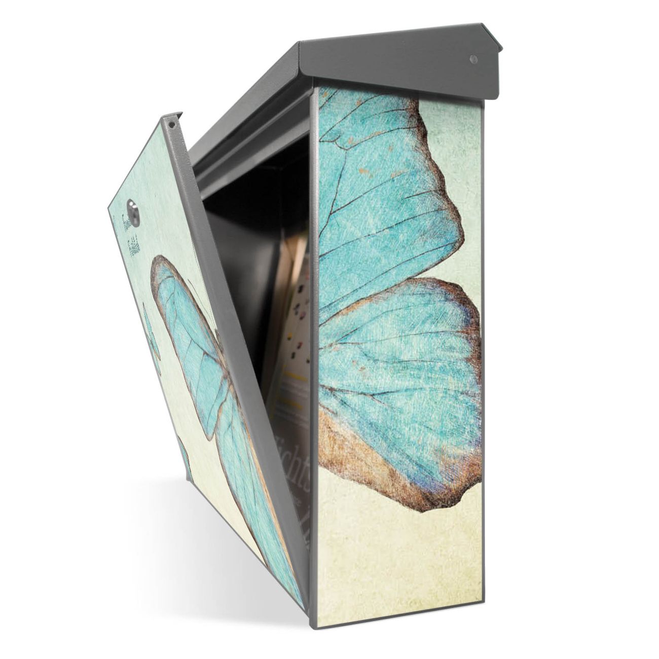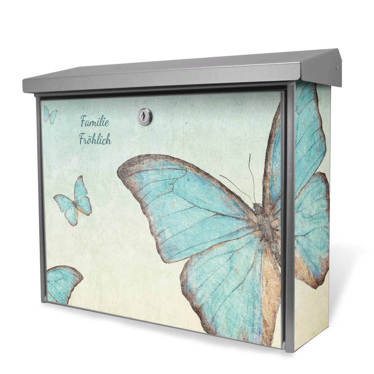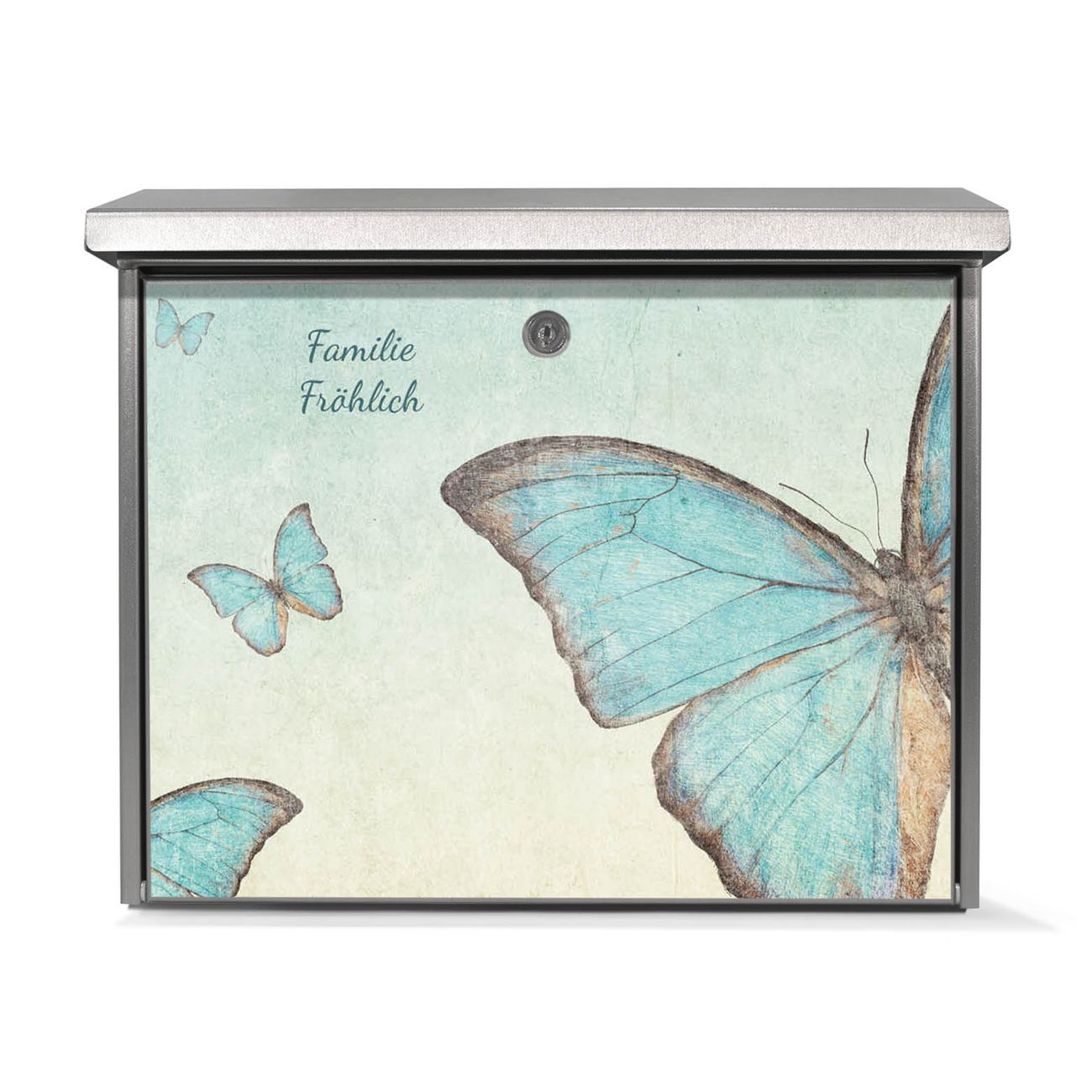 Der Postkasten mit Blaue Schmetterlinge Motiv hat ein sehr ansprechendes und zeitloses Design. Unsere Motivpalette hält jede Menge Varianten bereit, ob klassisch, modern, verspielt oder witzig - für jeden haben wir das passende Motiv parat. Der Briefkasten ist das Aushängeschild Ihres Hauses.