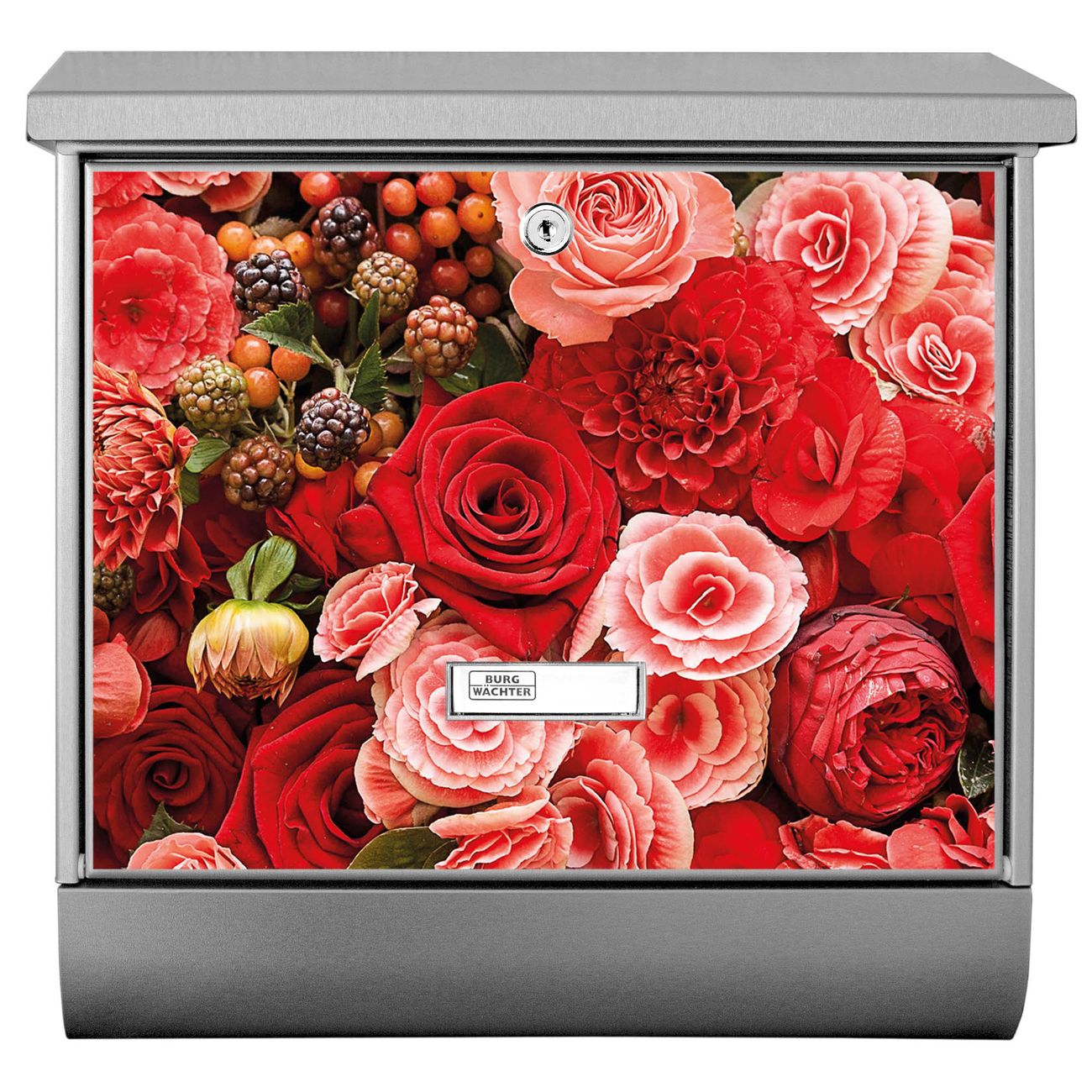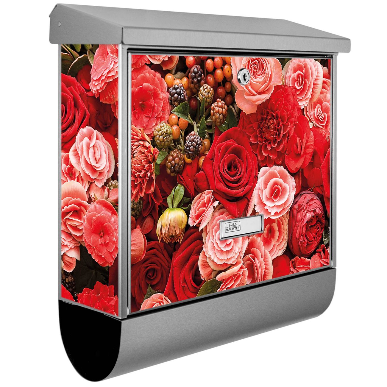 Der BURG-WÄCHTER Edelstahl Briefkasten mit Motiv Bouquet in Rot und Zeitungsrolle bietet Ihnen mit seinem Fassungsvermögen genügend Platz auch für große A4 Sendungen und Zeitschriften. Das integrierte Regendach schützt Ihre Post vor dem Eindringen von Regen.