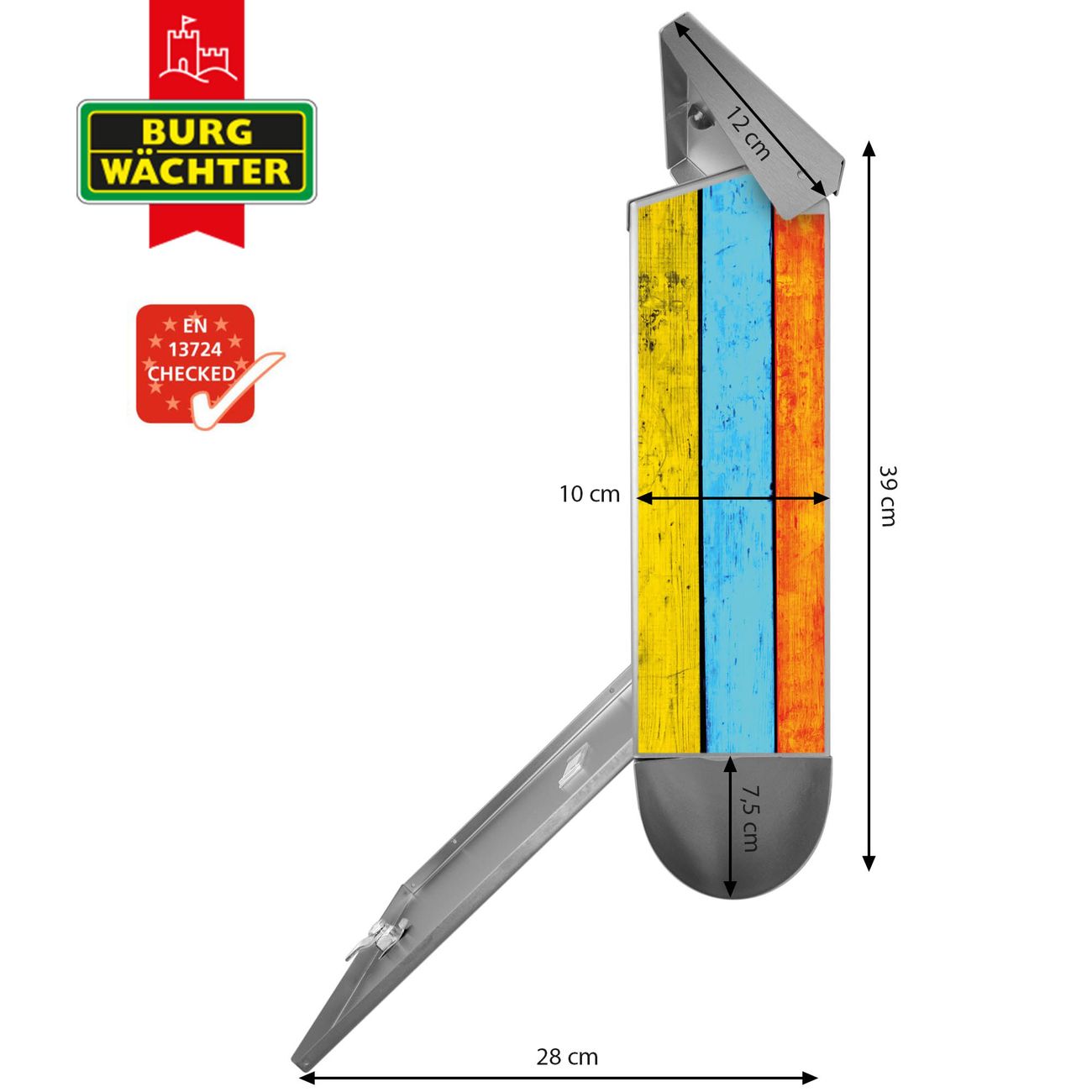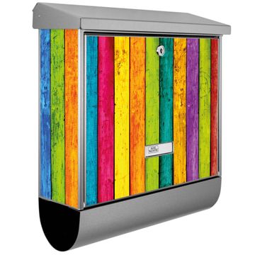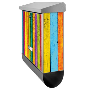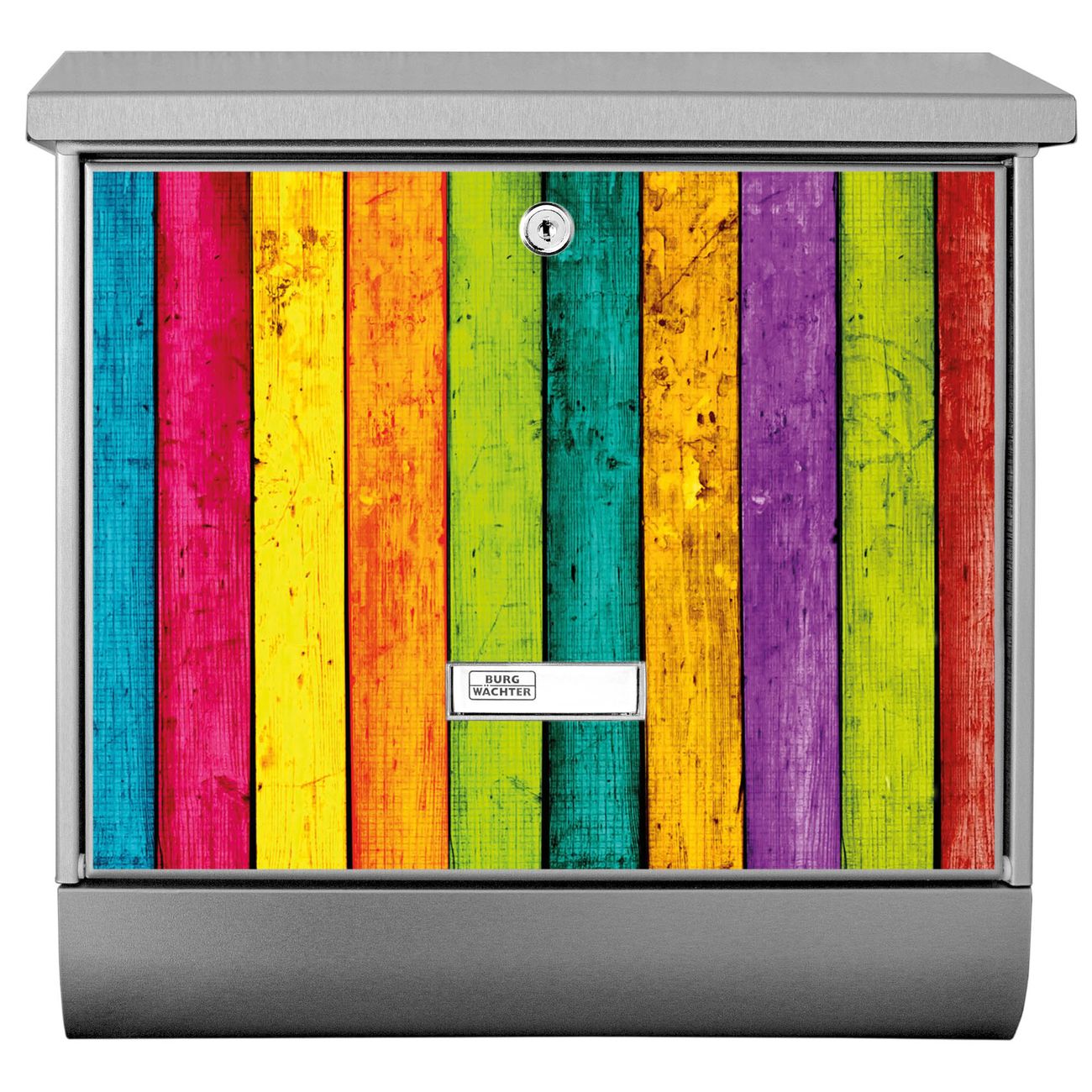 Der BURG-WÄCHTER Edelstahl Briefkasten mit Motiv Bunte Holzlatten und Zeitungsrolle bietet Ihnen mit seinem Fassungsvermögen genügend Platz auch für große A4 Sendungen und Zeitschriften. Das integrierte Regendach schützt Ihre Post vor dem Eindringen von Regen.