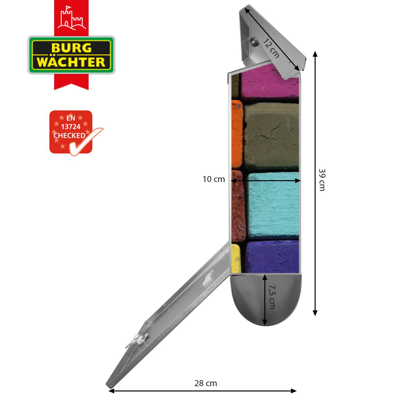 Der BURG-WÄCHTER Edelstahl Briefkasten mit Motiv Bunte Kreide und Zeitungsrolle bietet Ihnen mit seinem Fassungsvermögen genügend Platz auch für große A4 Sendungen und Zeitschriften. Das integrierte Regendach schützt Ihre Post vor dem Eindringen von Regen.