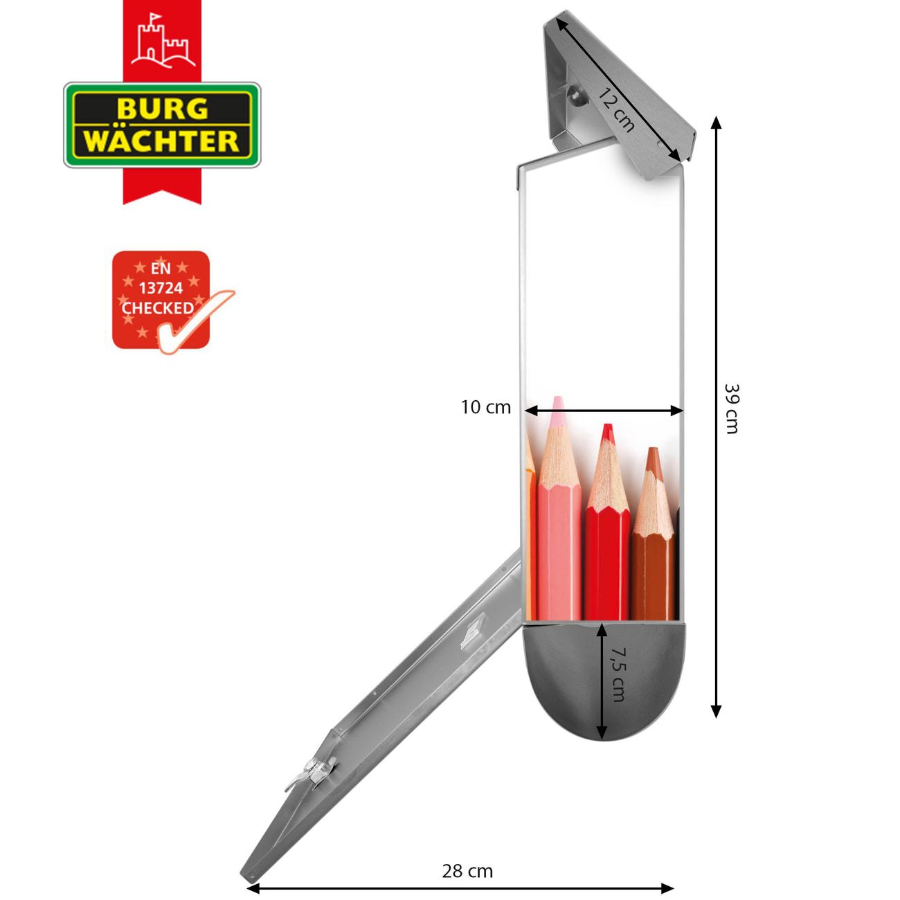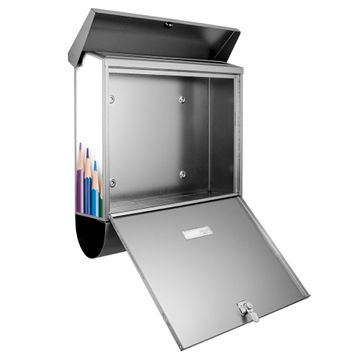 Der BURG-WÄCHTER Edelstahl Briefkasten mit Motiv Buntstifte und Zeitungsrolle bietet Ihnen mit seinem Fassungsvermögen genügend Platz auch für große A4 Sendungen und Zeitschriften. Das integrierte Regendach schützt Ihre Post vor dem Eindringen von Regen.