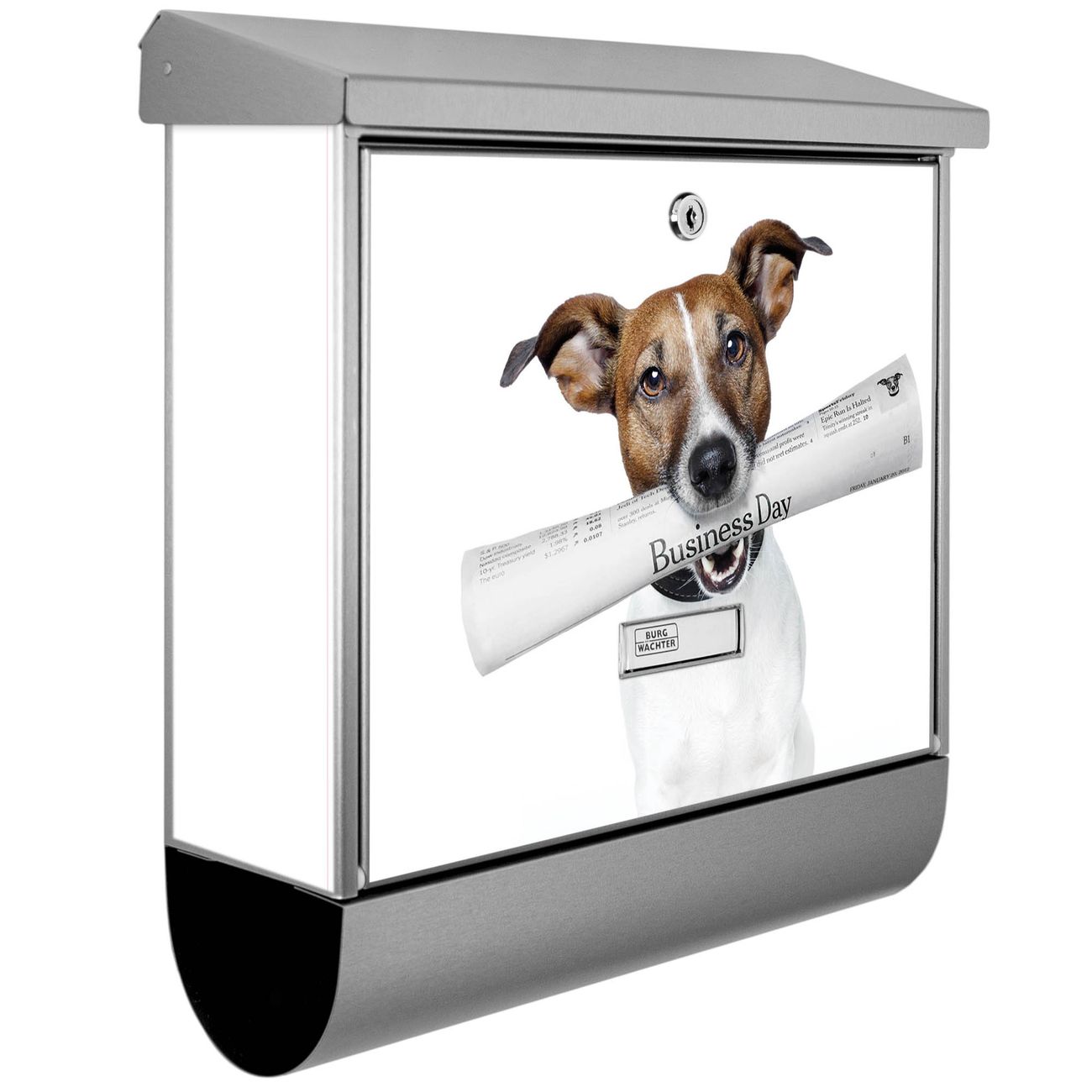 Der BURG-WÄCHTER Edelstahl Briefkasten mit Motiv Business Day und Zeitungsrolle bietet Ihnen mit seinem Fassungsvermögen genügend Platz auch für große A4 Sendungen und Zeitschriften. Das integrierte Regendach schützt Ihre Post vor dem Eindringen von Regen.