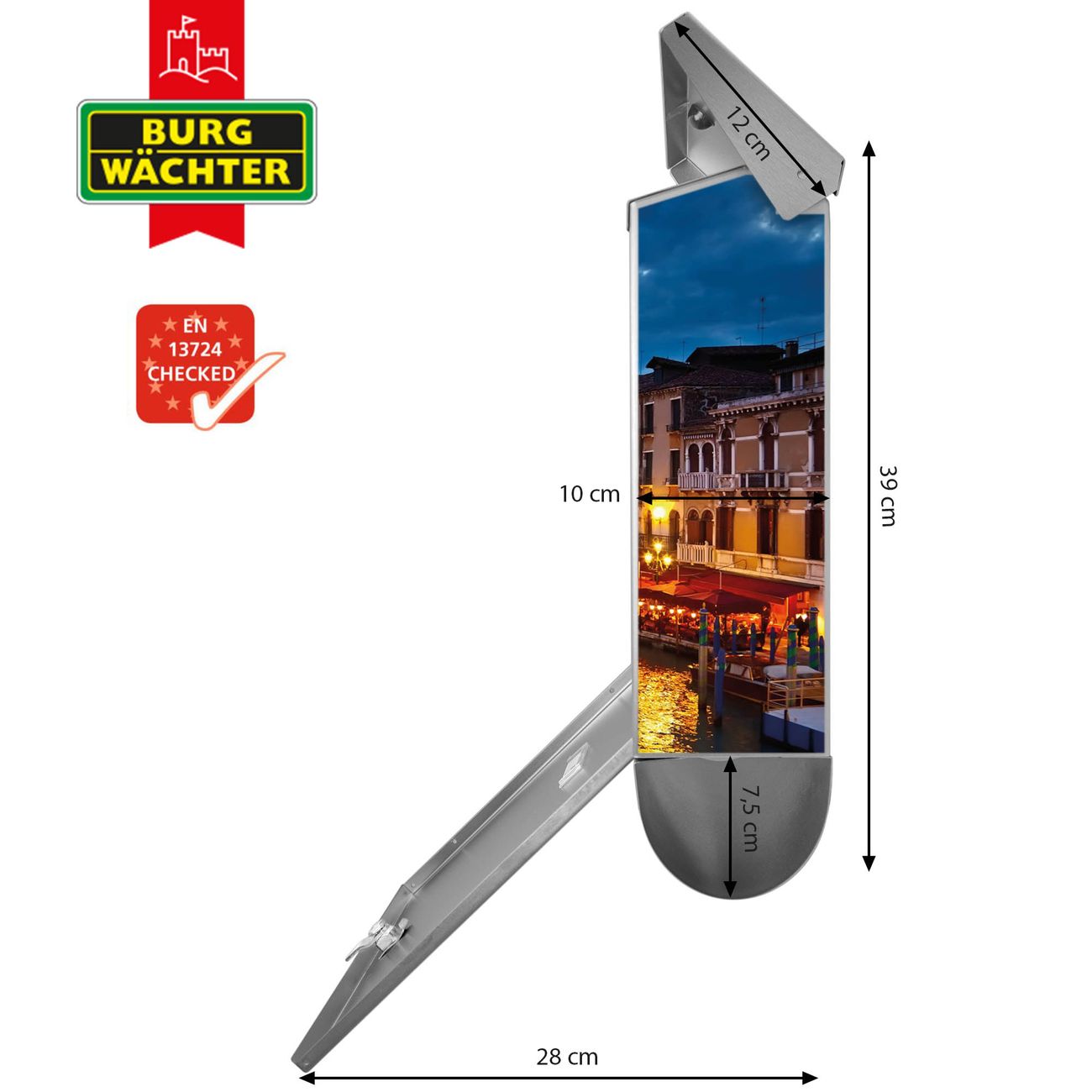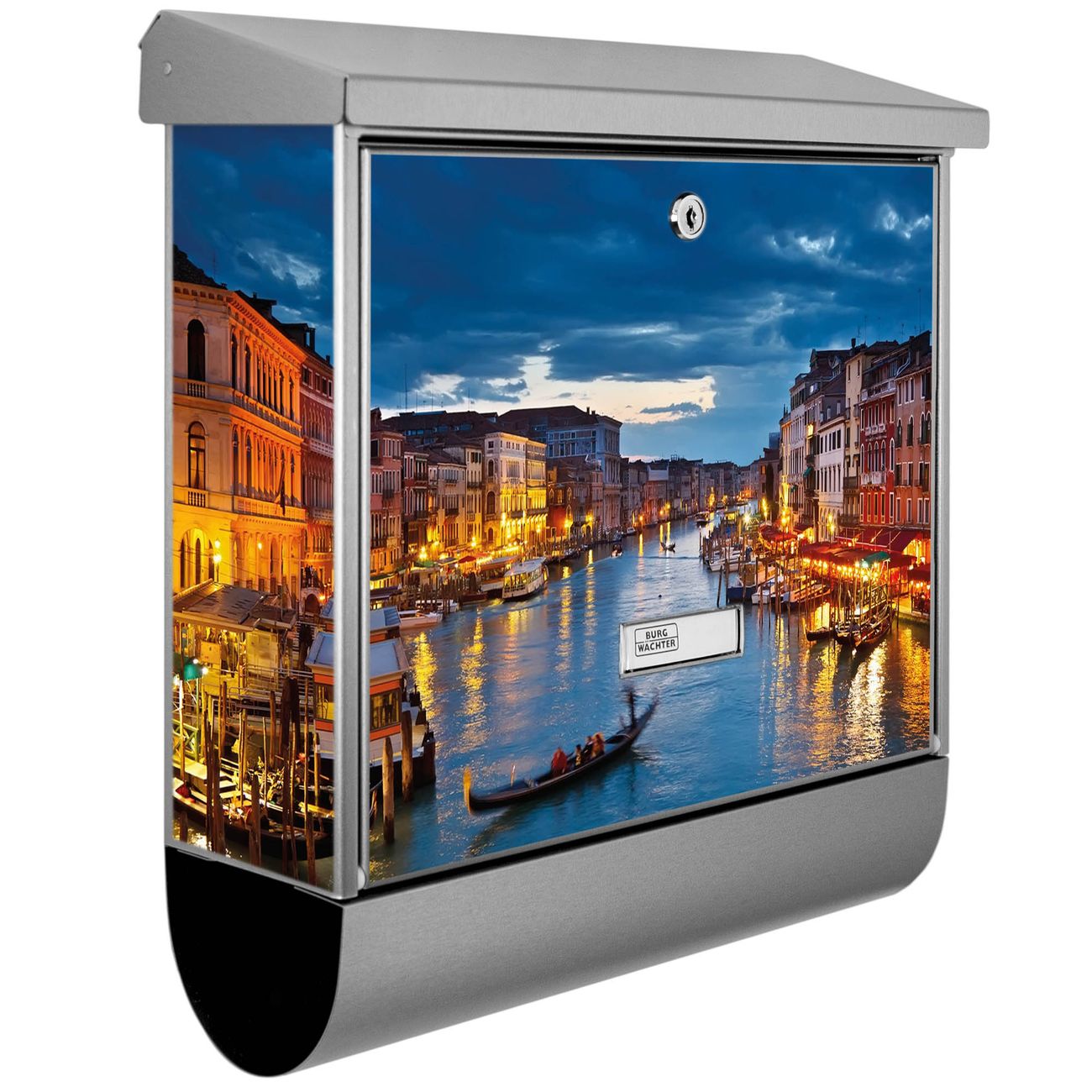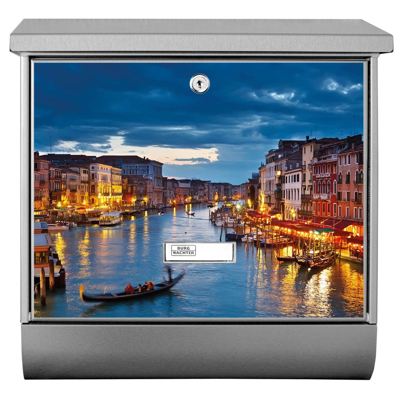 Der BURG-WÄCHTER Edelstahl Briefkasten mit Motiv Canale Grande Bei Nacht und Zeitungsrolle bietet Ihnen mit seinem Fassungsvermögen genügend Platz auch für große A4 Sendungen und Zeitschriften. Das integrierte Regendach schützt Ihre Post vor dem Eindringen von Regen.