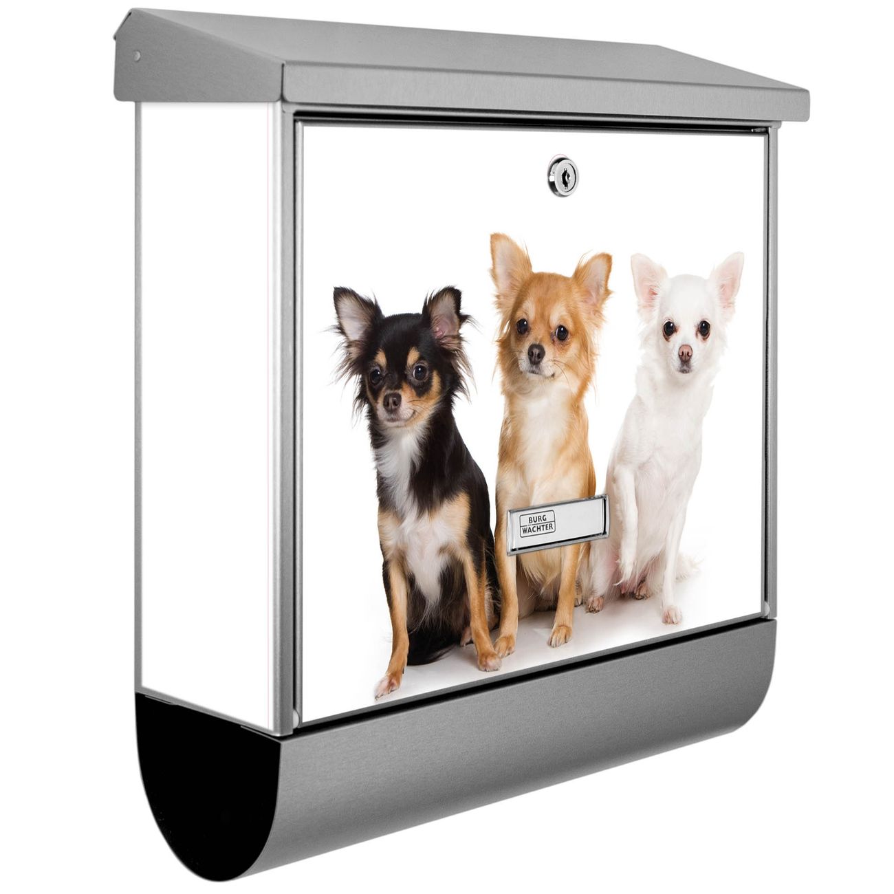 Der BURG-WÄCHTER Edelstahl Briefkasten mit Motiv Chihuahua und Zeitungsrolle bietet Ihnen mit seinem Fassungsvermögen genügend Platz auch für große A4 Sendungen und Zeitschriften. Das integrierte Regendach schützt Ihre Post vor dem Eindringen von Regen.