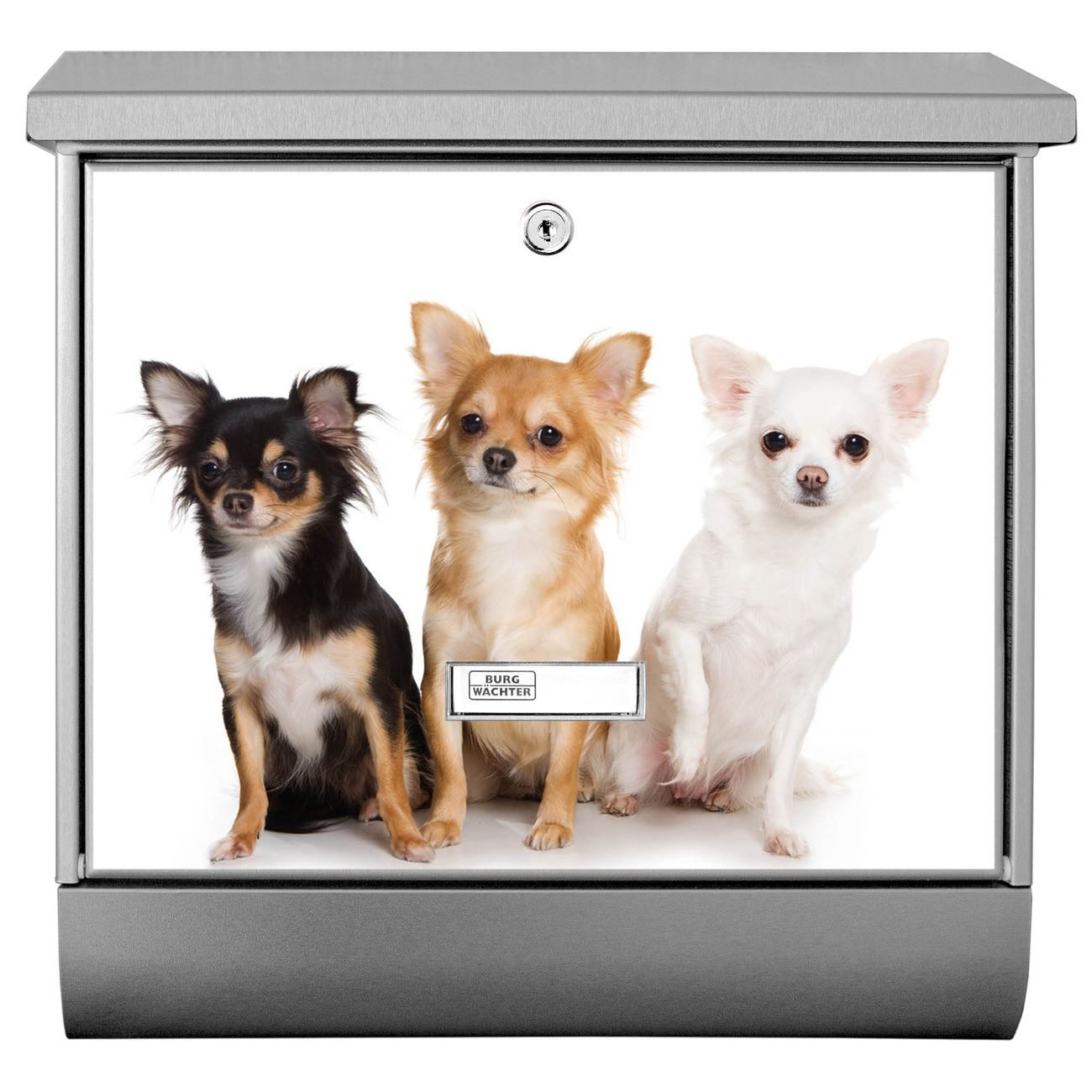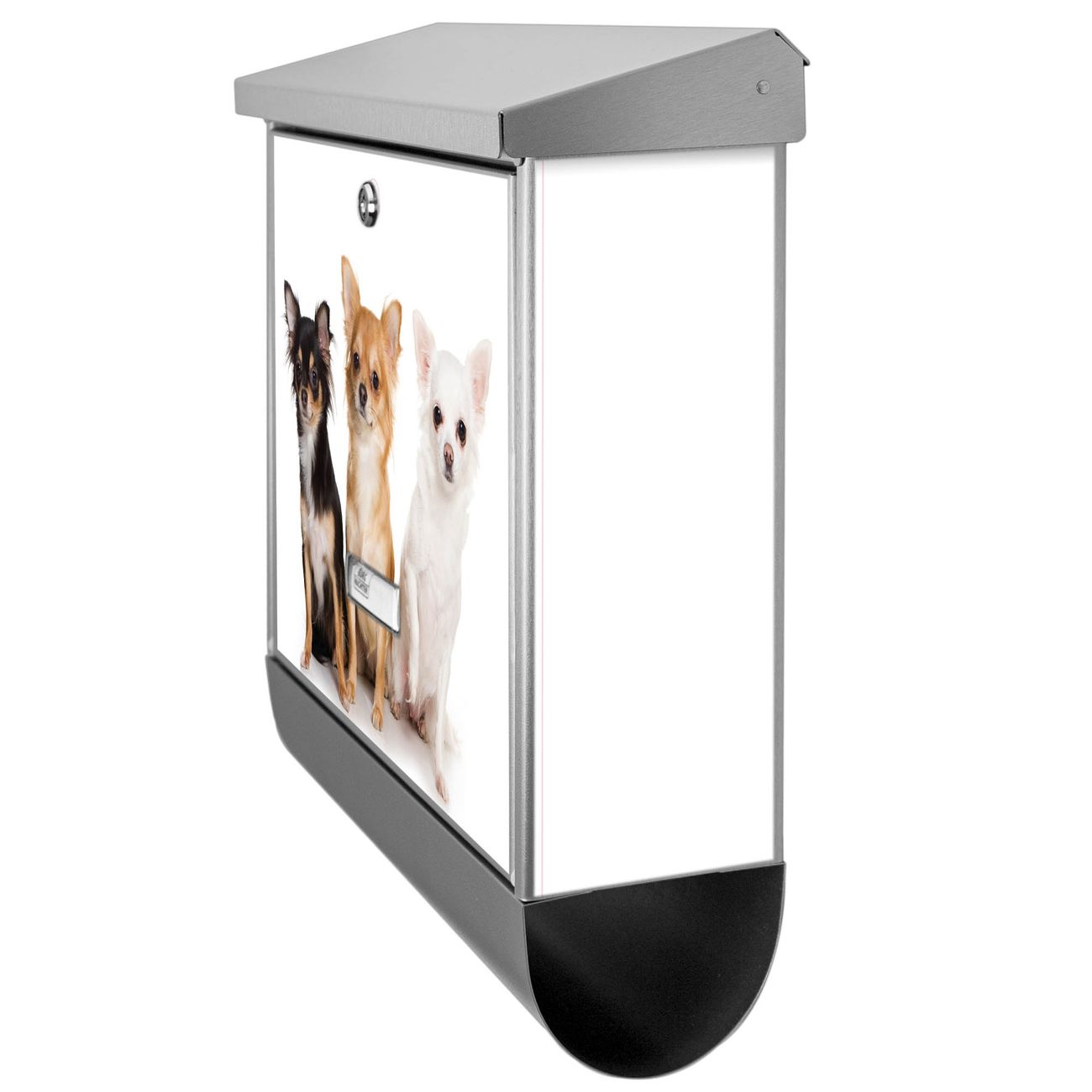 Der Chihuahua Motivbriefkasten hat ein sehr ansprechendes und zeitloses Design. Unsere Motivpalette hält jede Menge Varianten bereit, ob klassisch, modern, verspielt oder witzig - für jeden haben wir das passende Motiv parat. Der Briefkasten mit Zeitungsfach ist Ihr Aushängeschild, heben Sie Sich ab ohne auf Funktionalität zu verzichten.