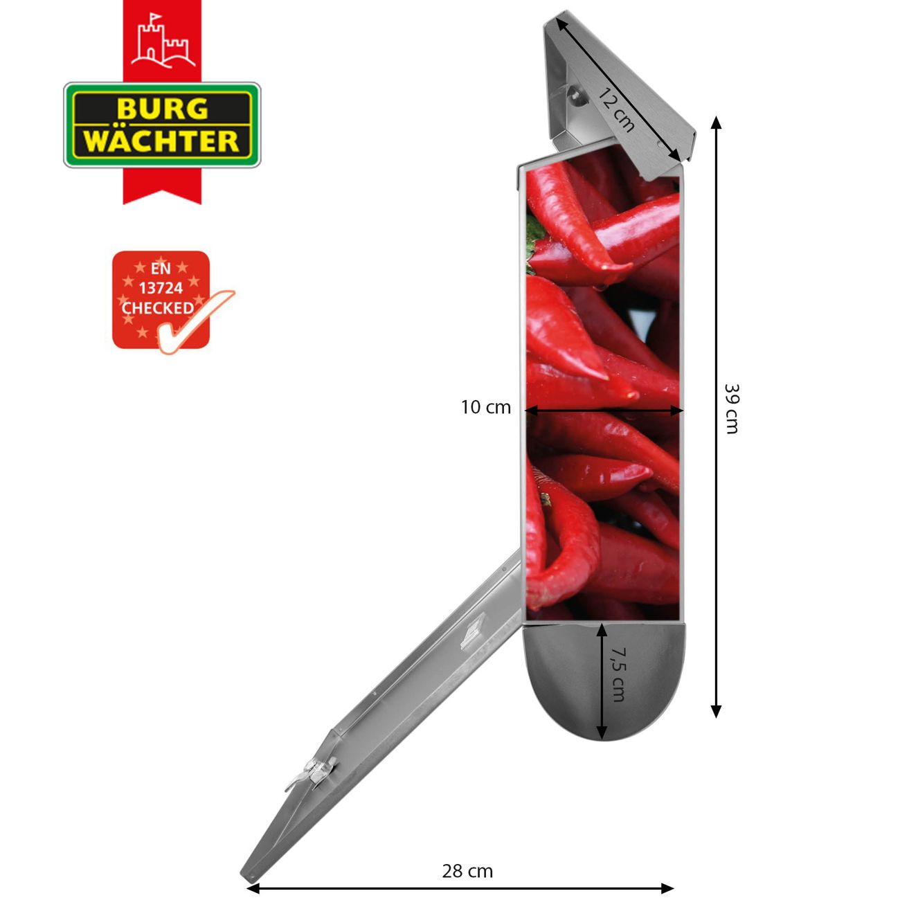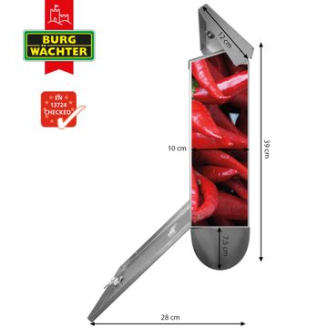 Der BURG-WÄCHTER Edelstahl Briefkasten mit Motiv Chilli und Zeitungsrolle bietet Ihnen mit seinem Fassungsvermögen genügend Platz auch für große A4 Sendungen und Zeitschriften. Das integrierte Regendach schützt Ihre Post vor dem Eindringen von Regen.