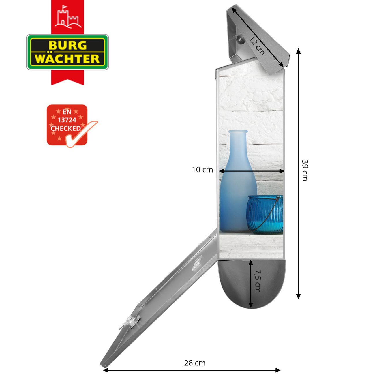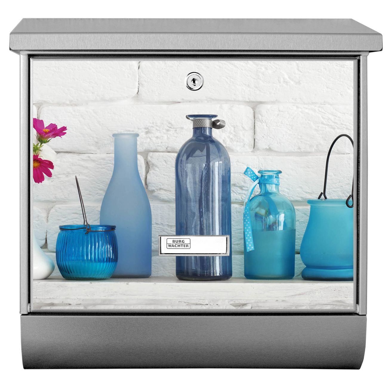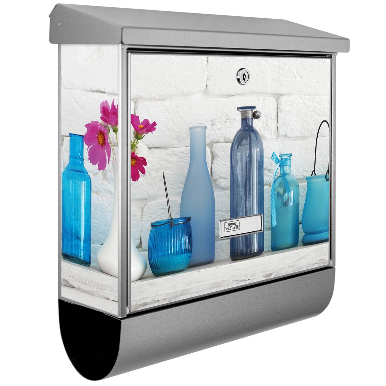 Der BURG-WÄCHTER Edelstahl Briefkasten mit Motiv Dekoartikel Blau und Zeitungsrolle bietet Ihnen mit seinem Fassungsvermögen genügend Platz auch für große A4 Sendungen und Zeitschriften. Das integrierte Regendach schützt Ihre Post vor dem Eindringen von Regen.