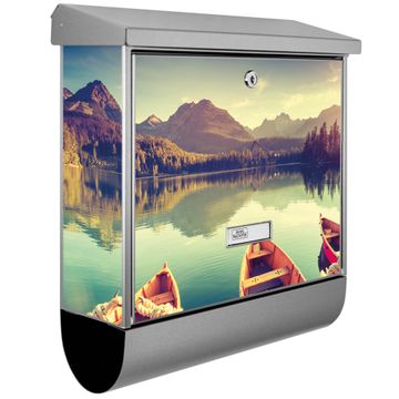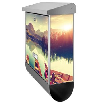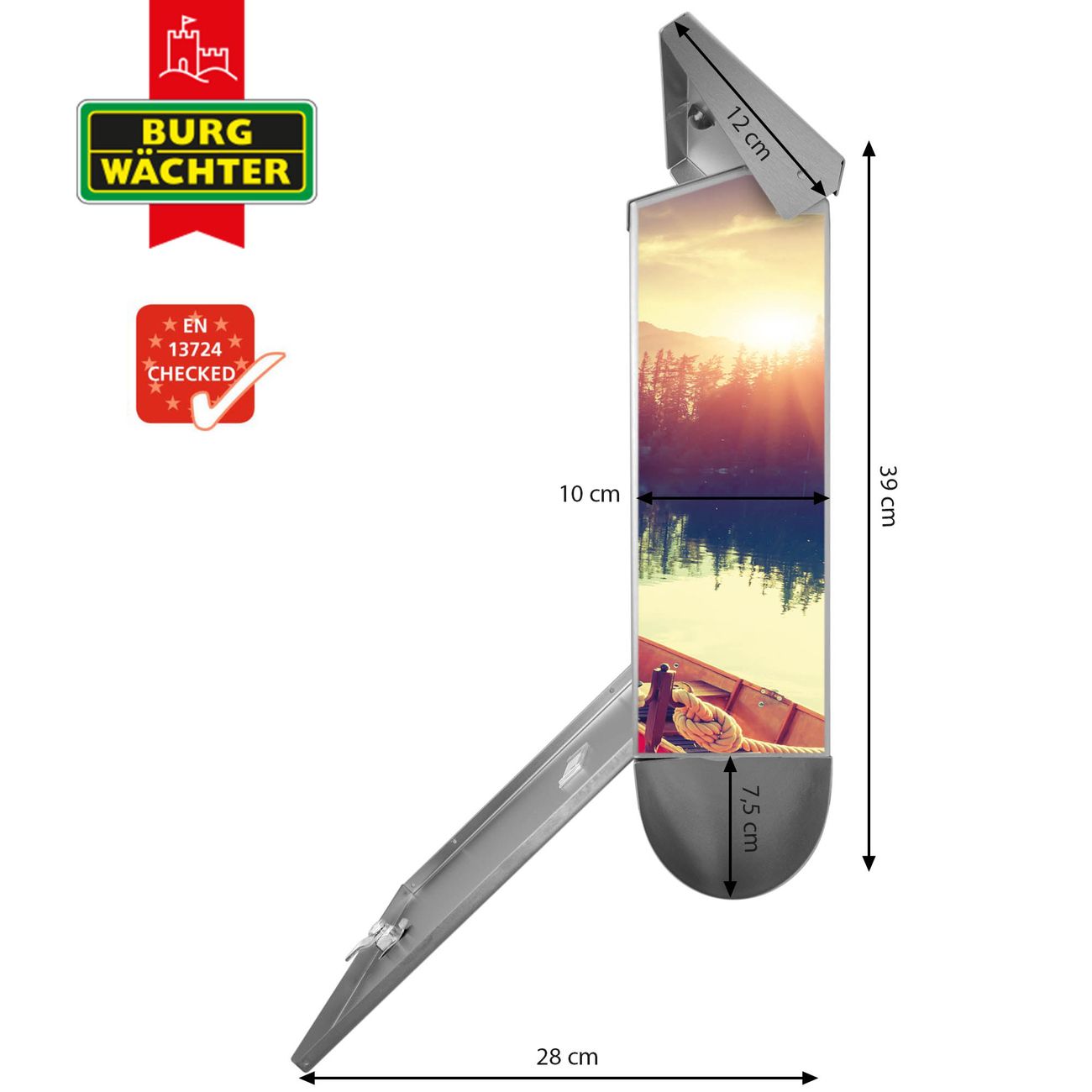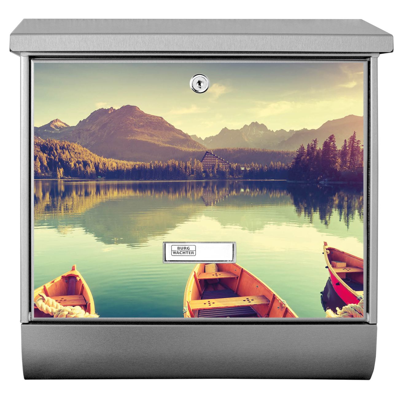 Der BURG-WÄCHTER Edelstahl Briefkasten mit Motiv Drei Boote Am Steg und Zeitungsrolle bietet Ihnen mit seinem Fassungsvermögen genügend Platz auch für große A4 Sendungen und Zeitschriften. Das integrierte Regendach schützt Ihre Post vor dem Eindringen von Regen.