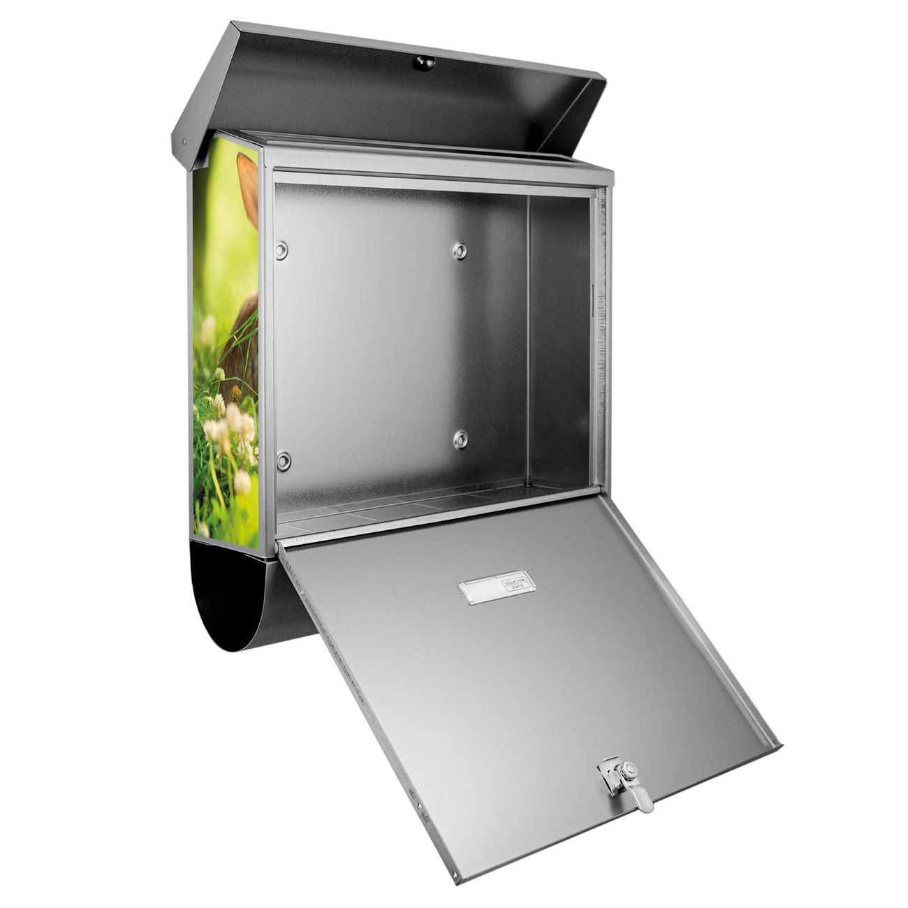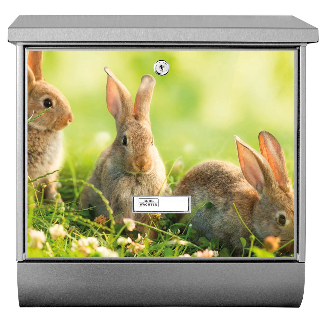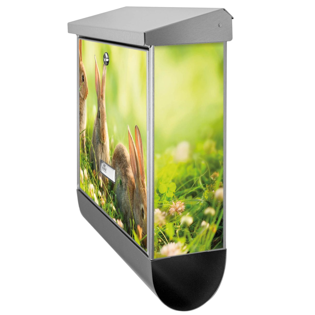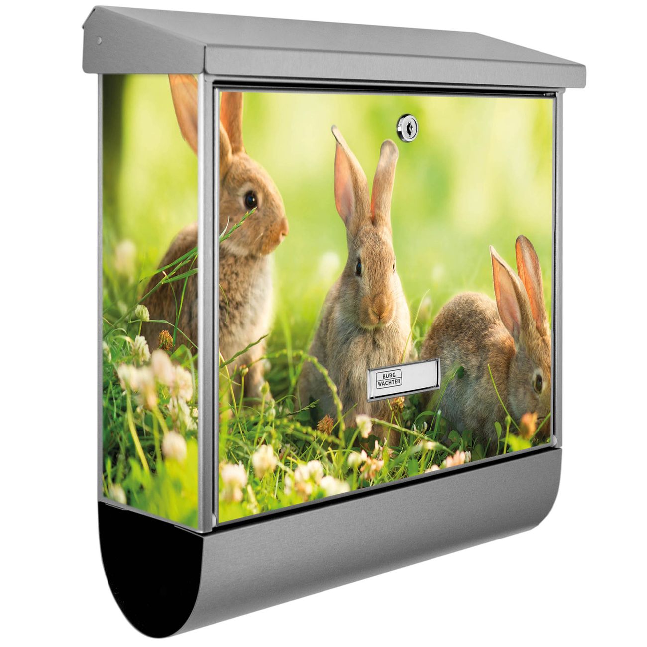 Der BURG-WÄCHTER Edelstahl Briefkasten mit Motiv Drei Hasen und Zeitungsrolle bietet Ihnen mit seinem Fassungsvermögen genügend Platz auch für große A4 Sendungen und Zeitschriften. Das integrierte Regendach schützt Ihre Post vor dem Eindringen von Regen.