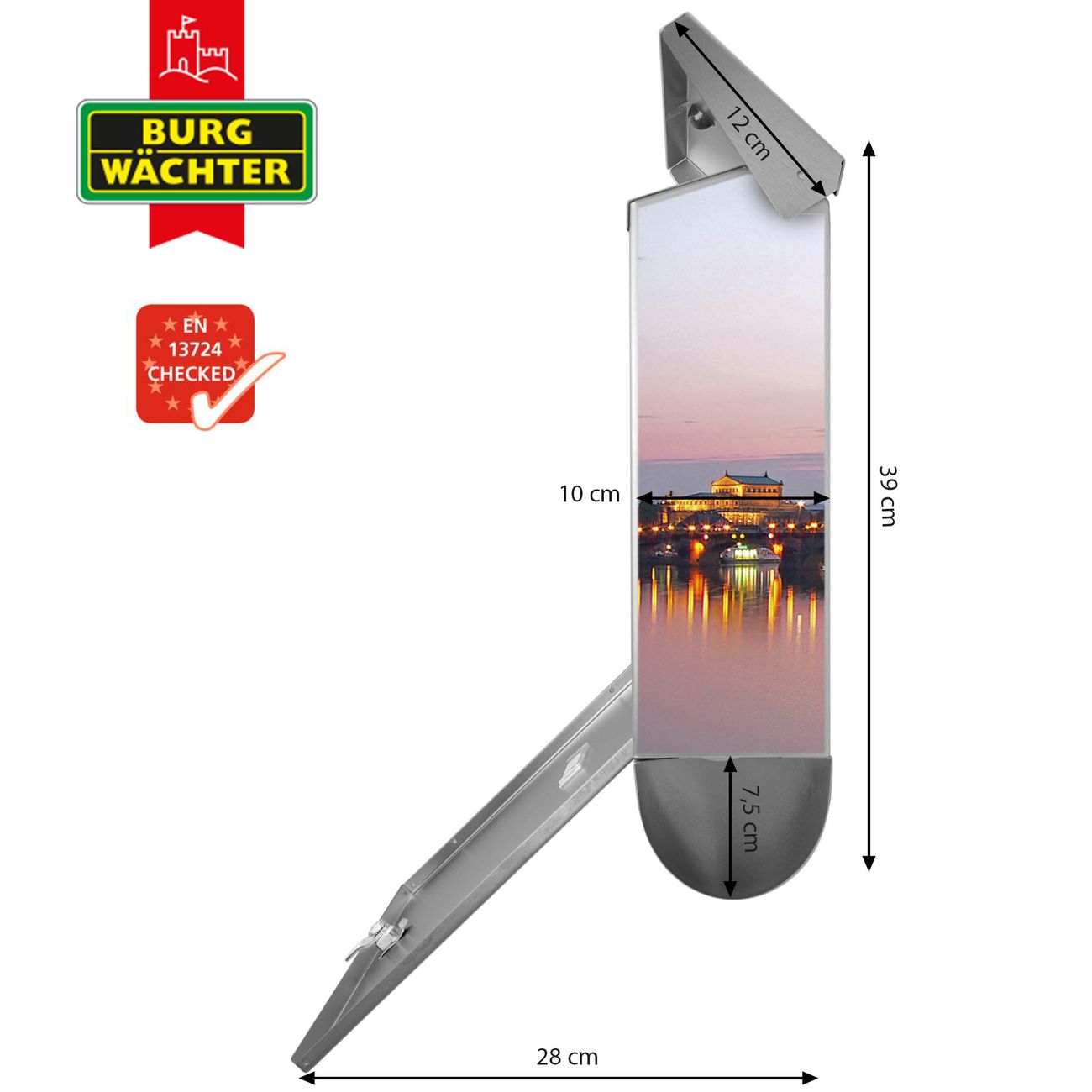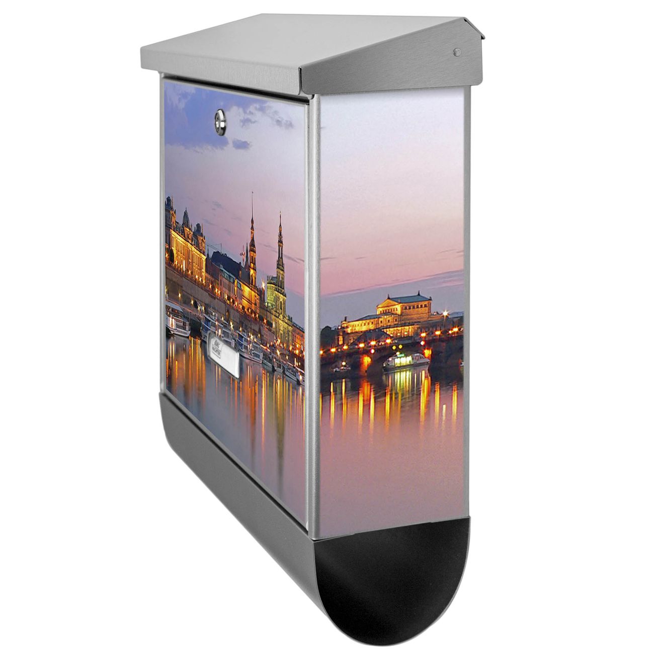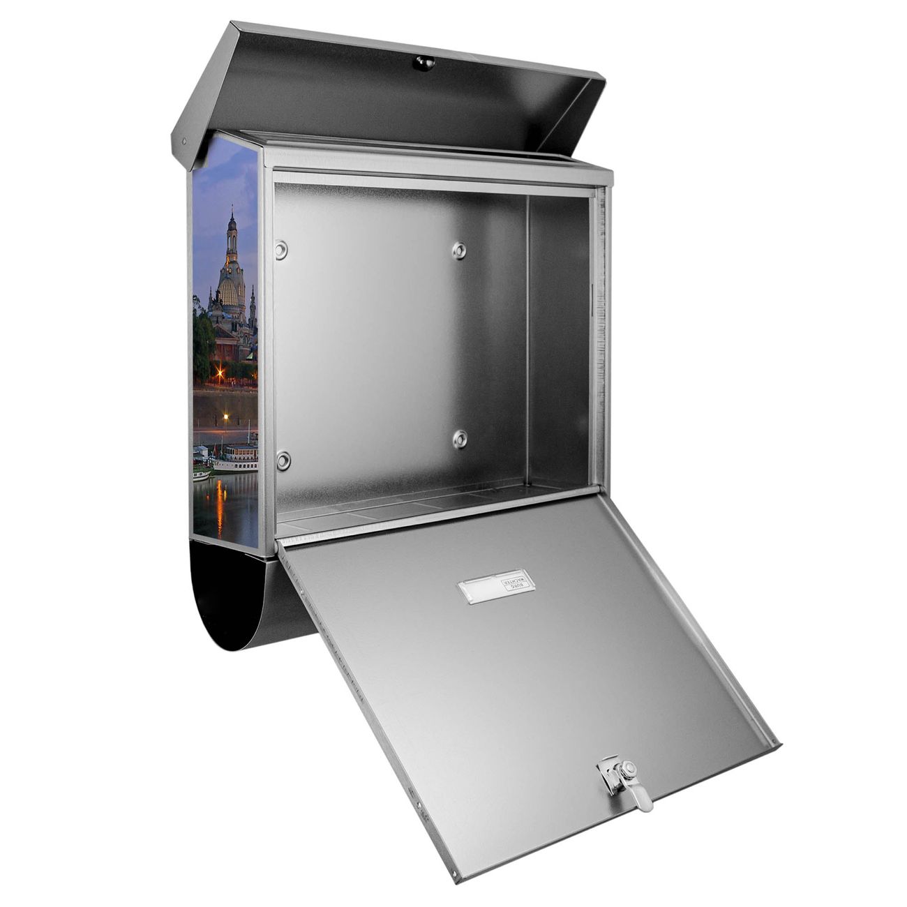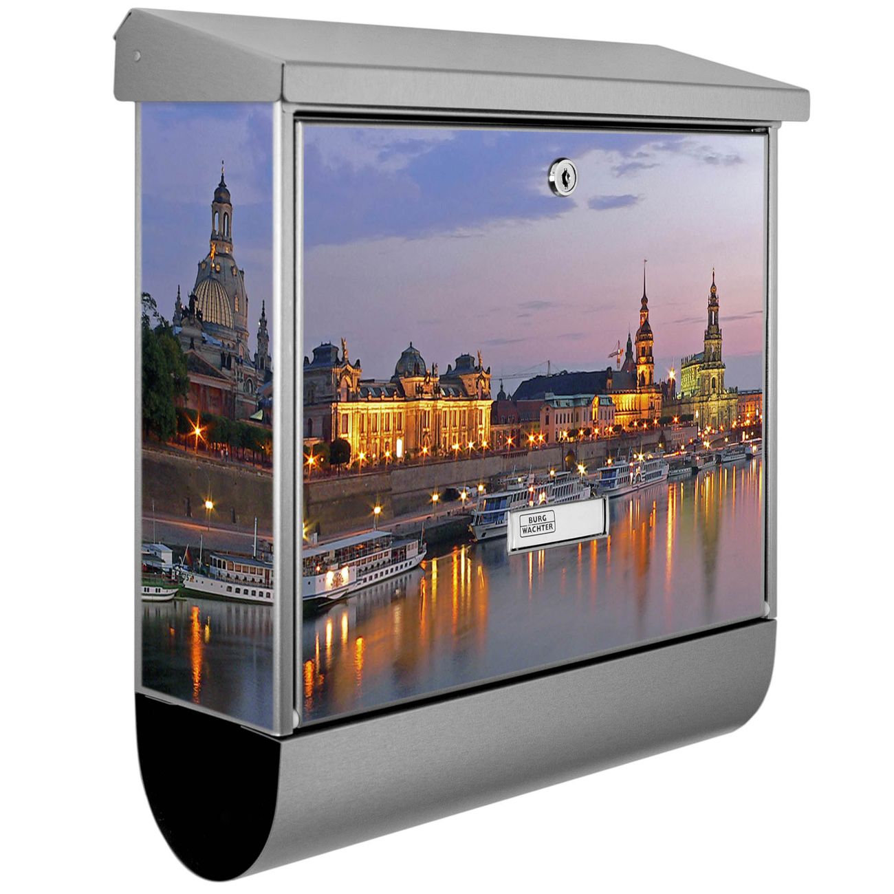 Der BURG-WÄCHTER Edelstahl Briefkasten mit Motiv Dresden und Zeitungsrolle bietet Ihnen mit seinem Fassungsvermögen genügend Platz auch für große A4 Sendungen und Zeitschriften. Das integrierte Regendach schützt Ihre Post vor dem Eindringen von Regen.