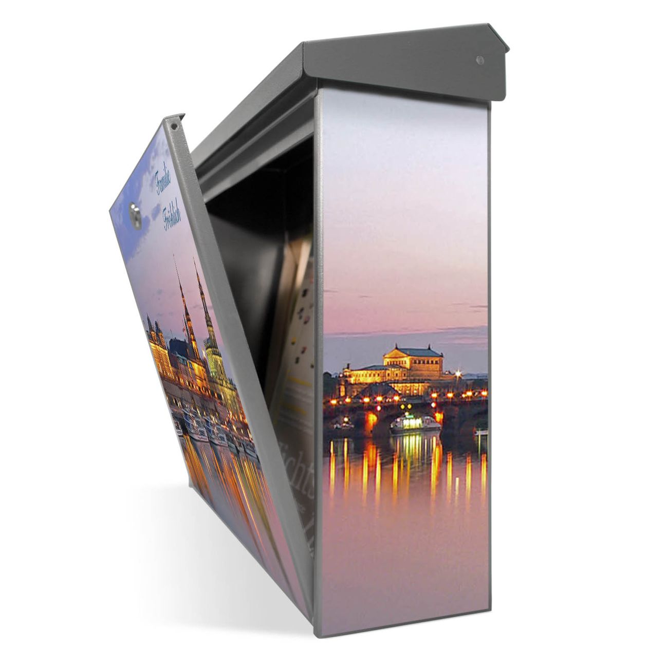 Der Postkasten mit Dresden Motiv hat ein sehr ansprechendes und zeitloses Design. Unsere Motivpalette hält jede Menge Varianten bereit, ob klassisch, modern, verspielt oder witzig - für jeden haben wir das passende Motiv parat. Der Briefkasten ist das Aushängeschild Ihres Hauses.