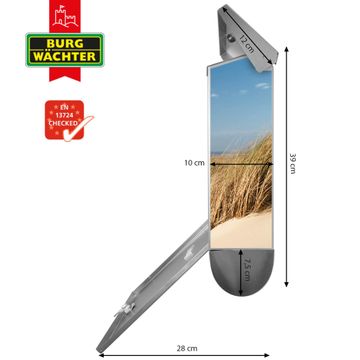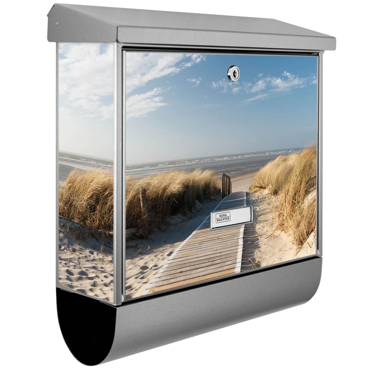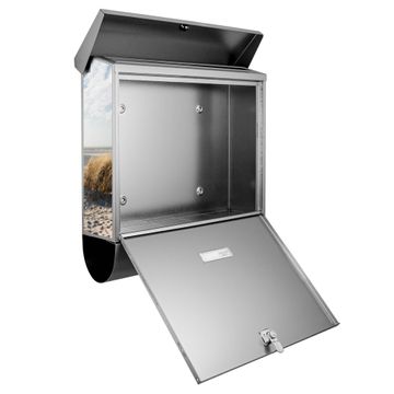 Der BURG-WÄCHTER Edelstahl Briefkasten mit Motiv Dünen und Zeitungsrolle bietet Ihnen mit seinem Fassungsvermögen genügend Platz auch für große A4 Sendungen und Zeitschriften. Das integrierte Regendach schützt Ihre Post vor dem Eindringen von Regen.
