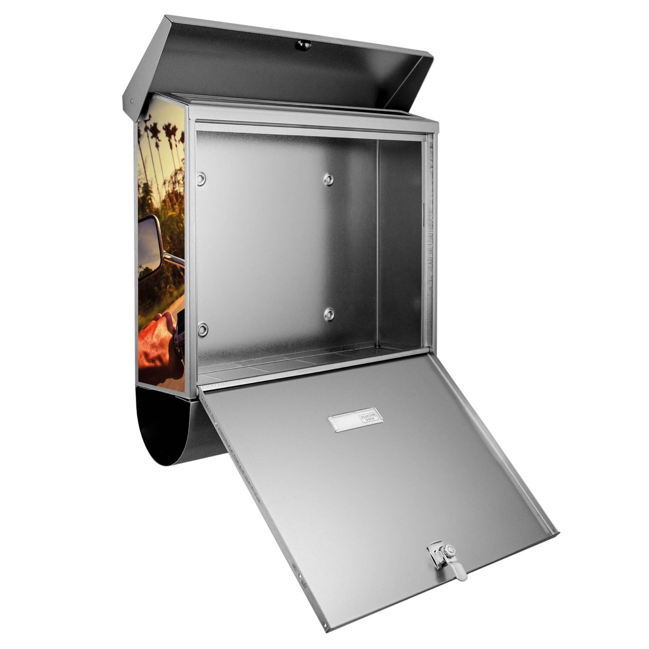 Der Briefkasten besteht aus Edelstahl, einem hochwertigen Material das rostfrei und äußerst unempfindlich gegenüber Witterungseinflüssen ist. Das Motiv besteht aus einer wetter- und UV-festen Folie, die Ihren Briefkasten zusätzlich vor Kratzern schützt. Der Postkasten ist je nach Auswahl 38 x 39 x 12 CM oder 38 x 31,5 x 12 cm (BxHxT) groß. Der Briefeinwurf ist 33,2cm x 3,1cm, Format DIN C4. Der Briefkasten wird mit Montagematerial und zwei Schlüsseln geliefert.