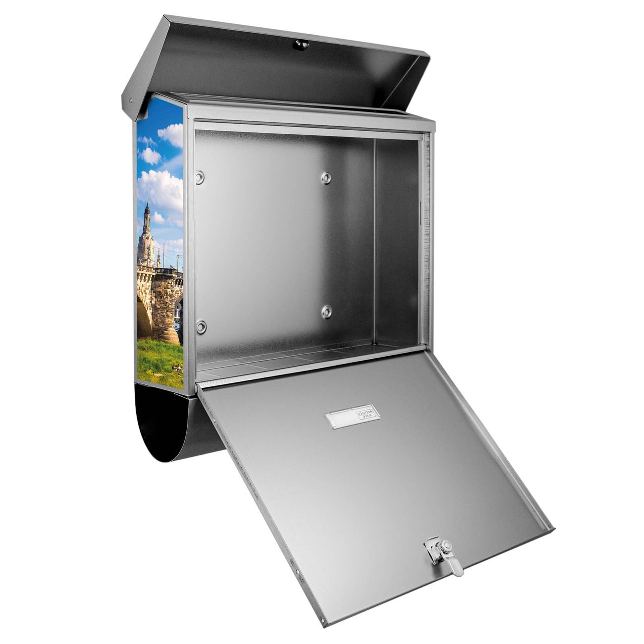 Der BURG-WÄCHTER Edelstahl Briefkasten mit Motiv Elbflorenz und Zeitungsrolle bietet Ihnen mit seinem Fassungsvermögen genügend Platz auch für große A4 Sendungen und Zeitschriften. Das integrierte Regendach schützt Ihre Post vor dem Eindringen von Regen.