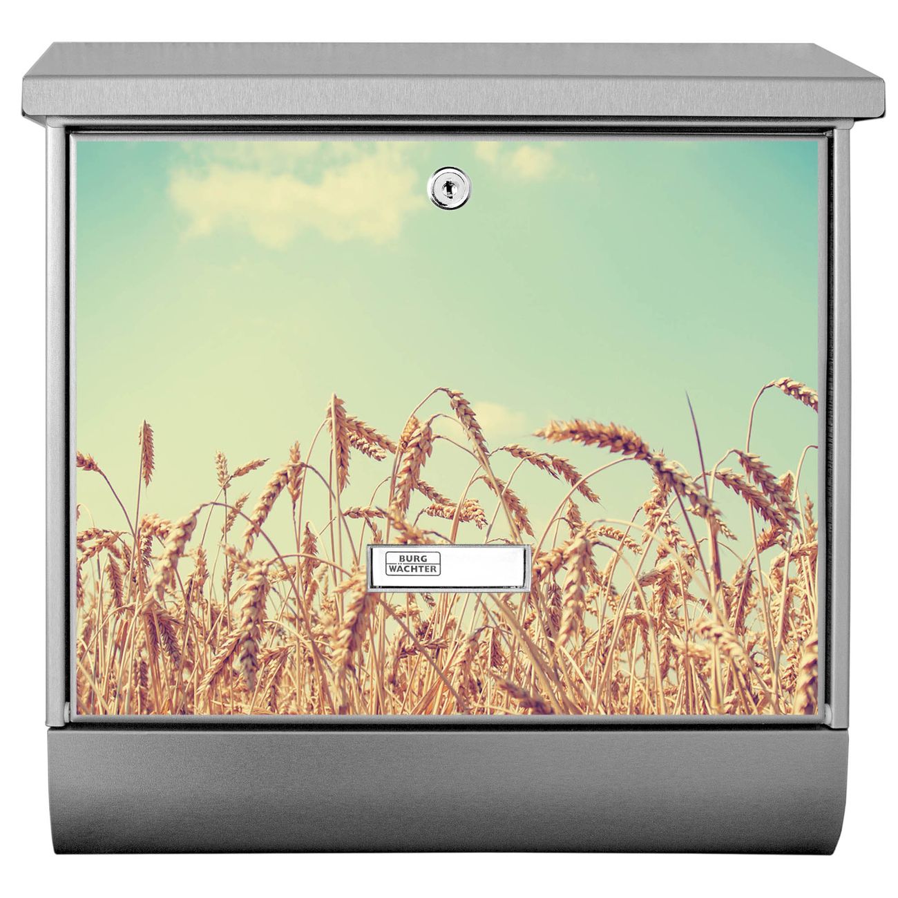 Der BURG-WÄCHTER Edelstahl Briefkasten mit Motiv Erntezeit und Zeitungsrolle bietet Ihnen mit seinem Fassungsvermögen genügend Platz auch für große A4 Sendungen und Zeitschriften. Das integrierte Regendach schützt Ihre Post vor dem Eindringen von Regen.