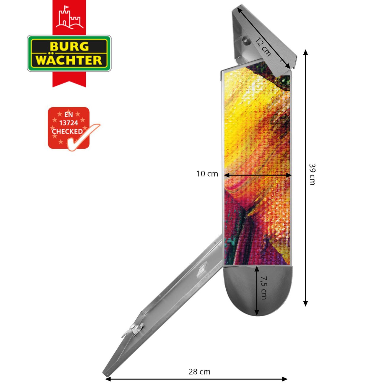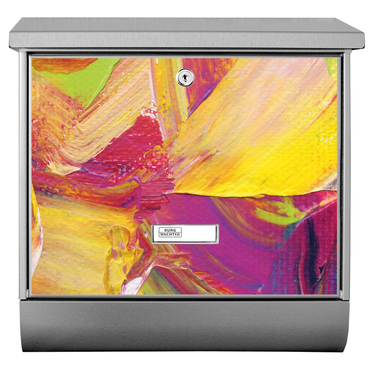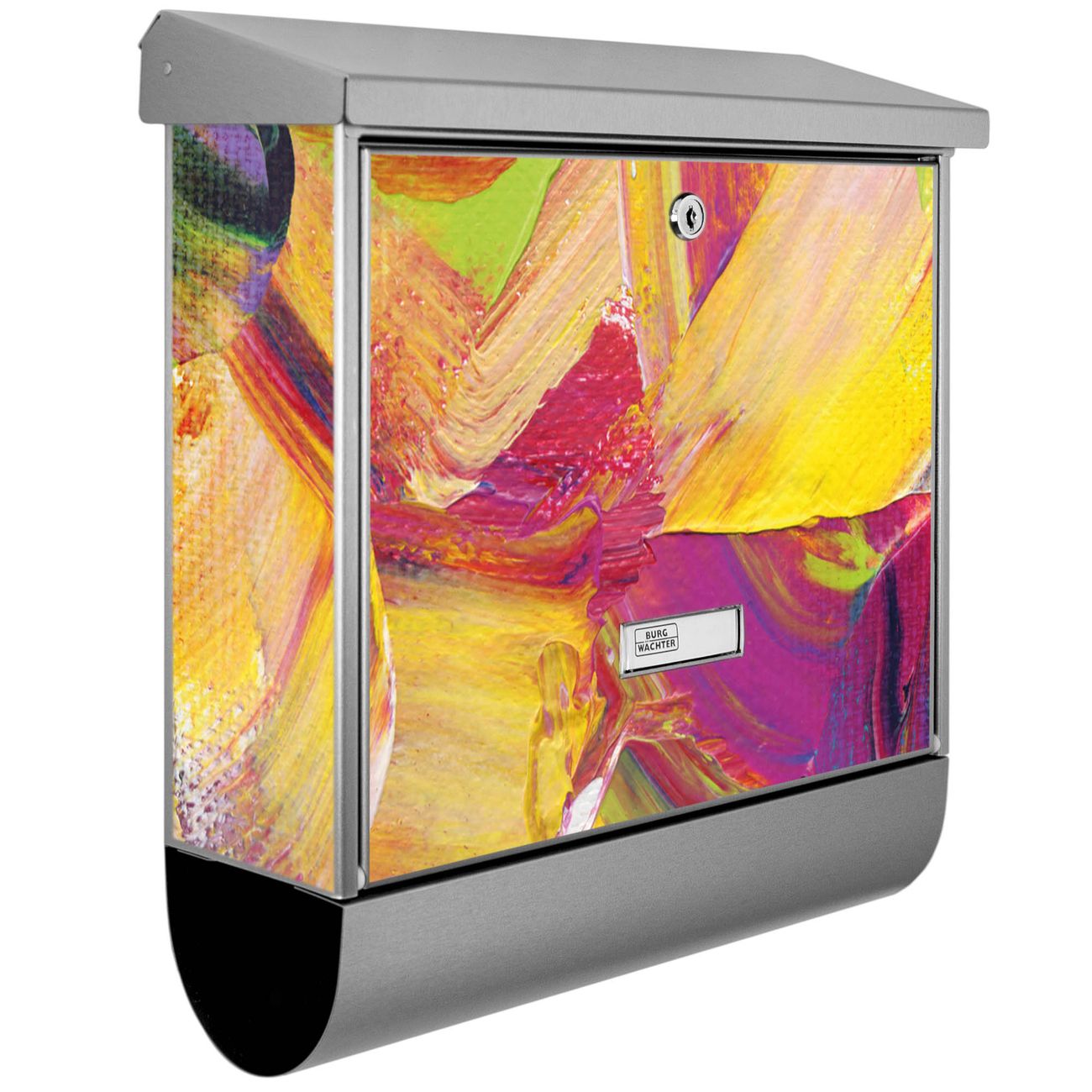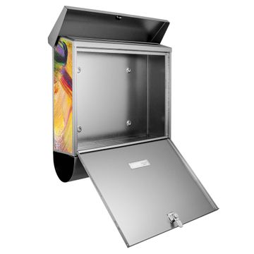 Der BURG-WÄCHTER Edelstahl Briefkasten mit Motiv Farbe auf Leinwand und Zeitungsrolle bietet Ihnen mit seinem Fassungsvermögen genügend Platz auch für große A4 Sendungen und Zeitschriften. Das integrierte Regendach schützt Ihre Post vor dem Eindringen von Regen.