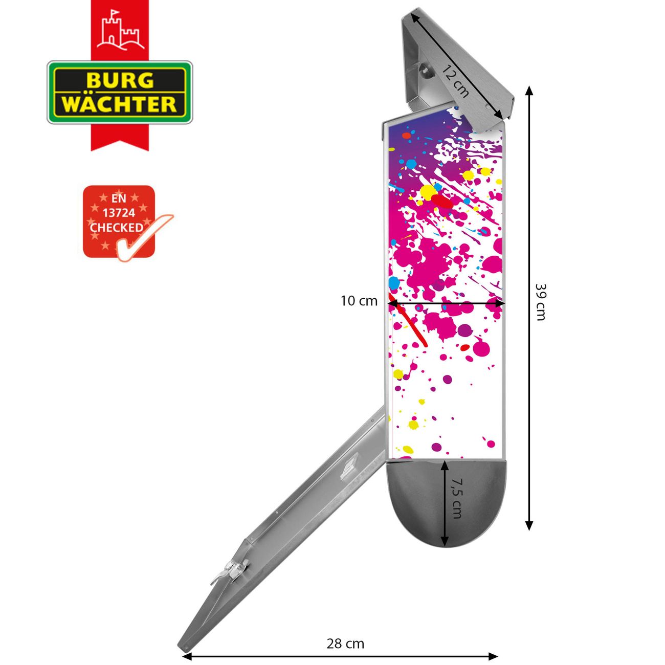 Der BURG-WÄCHTER Edelstahl Briefkasten mit Motiv Farbspritzer und Zeitungsrolle bietet Ihnen mit seinem Fassungsvermögen genügend Platz auch für große A4 Sendungen und Zeitschriften. Das integrierte Regendach schützt Ihre Post vor dem Eindringen von Regen.