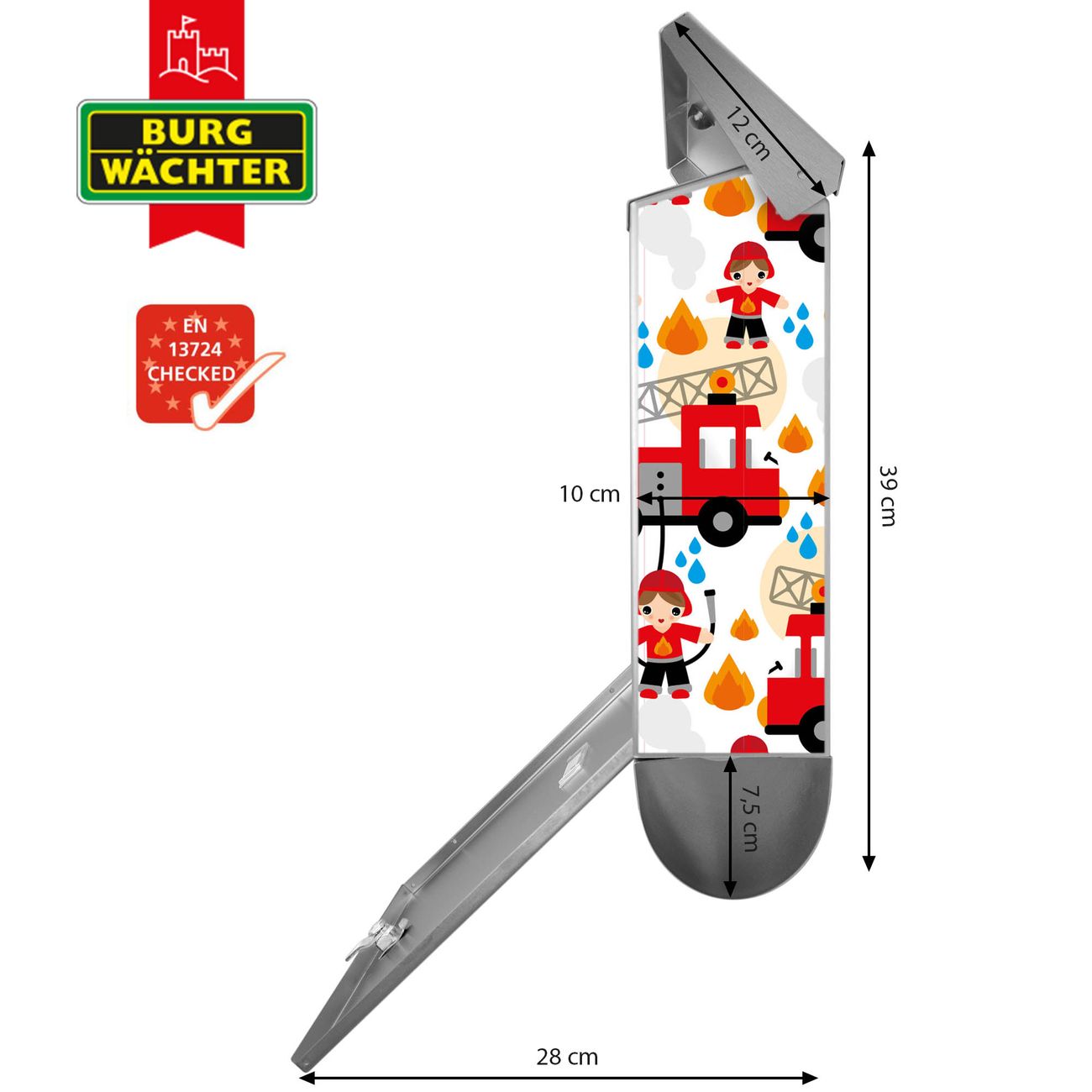 Der BURG-WÄCHTER Edelstahl Briefkasten mit Motiv Feuerwehr und Zeitungsrolle bietet Ihnen mit seinem Fassungsvermögen genügend Platz auch für große A4 Sendungen und Zeitschriften. Das integrierte Regendach schützt Ihre Post vor dem Eindringen von Regen.