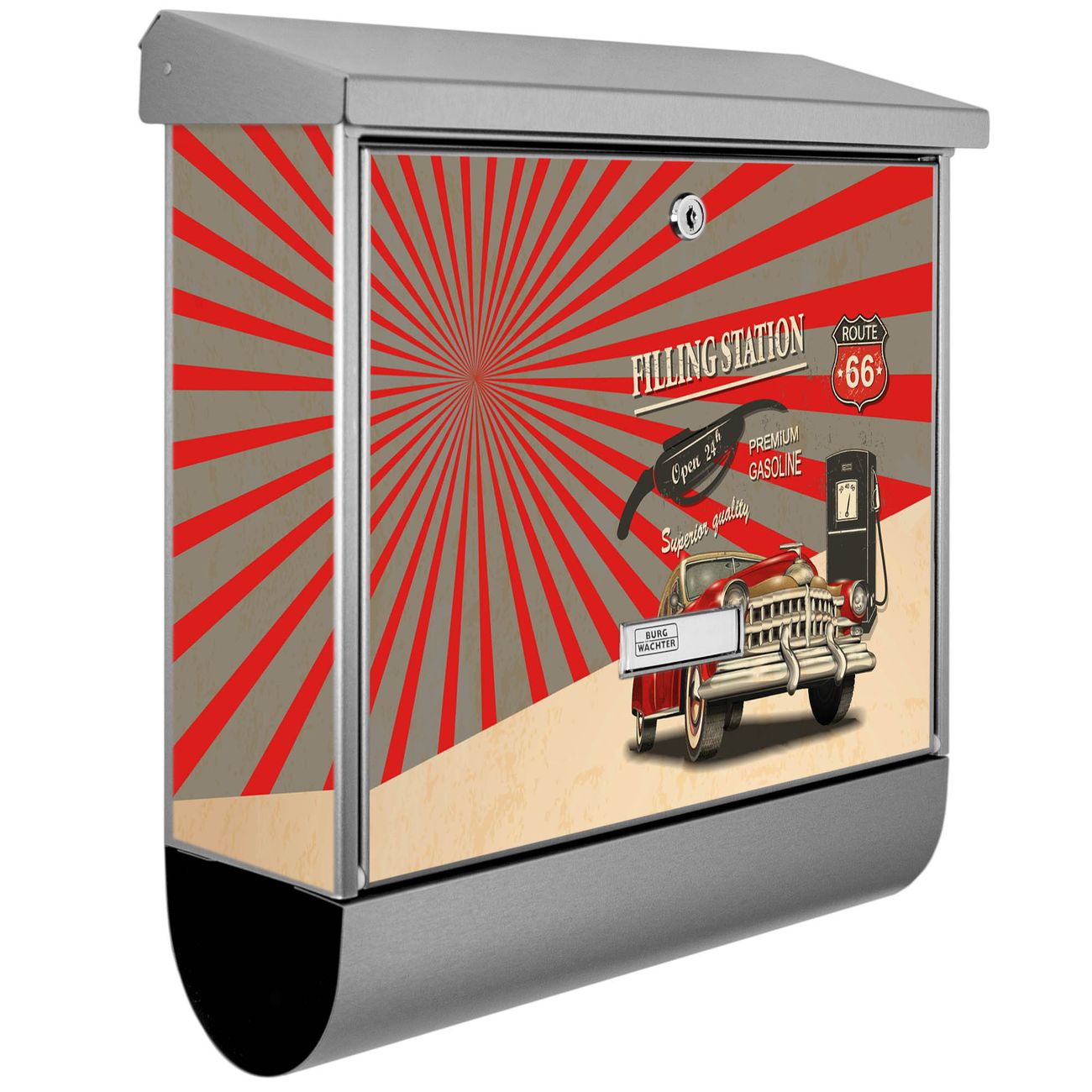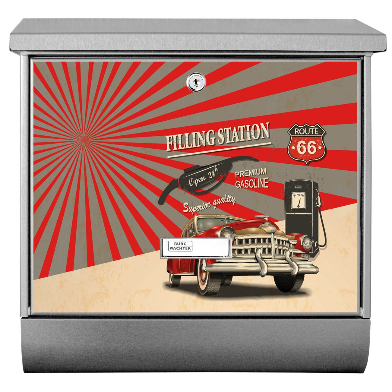 Der BURG-WÄCHTER Edelstahl Briefkasten mit Motiv Filling Station und Zeitungsrolle bietet Ihnen mit seinem Fassungsvermögen genügend Platz auch für große A4 Sendungen und Zeitschriften. Das integrierte Regendach schützt Ihre Post vor dem Eindringen von Regen.