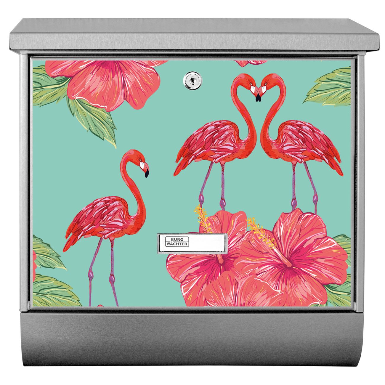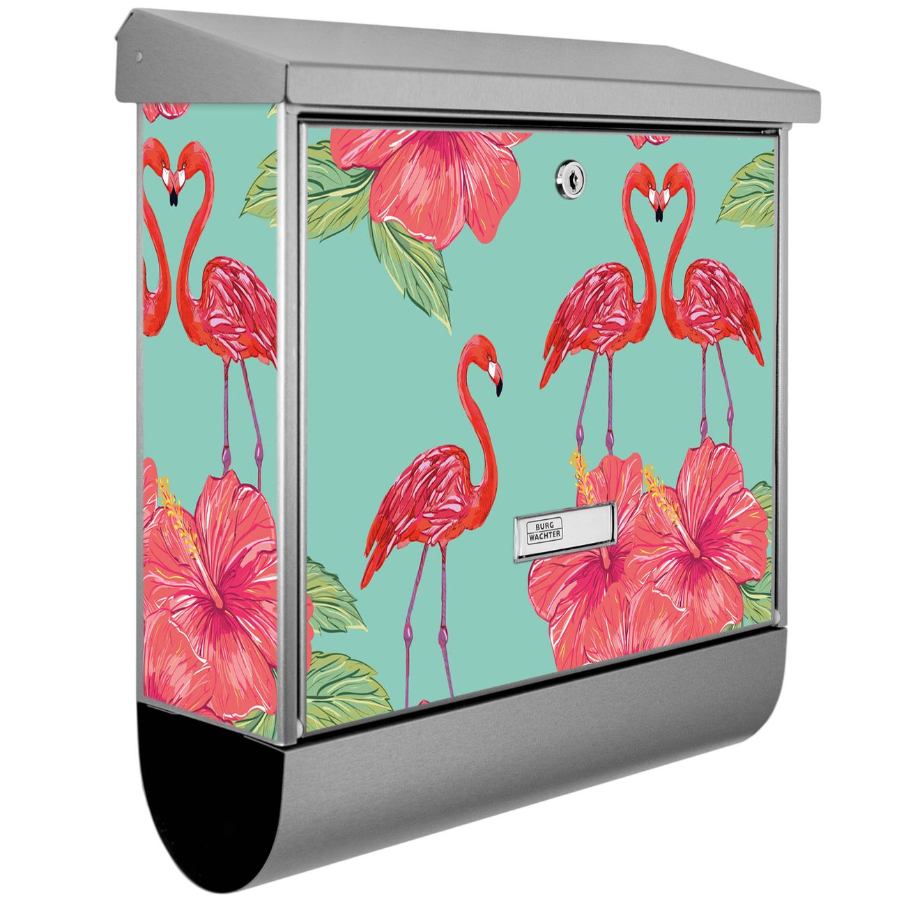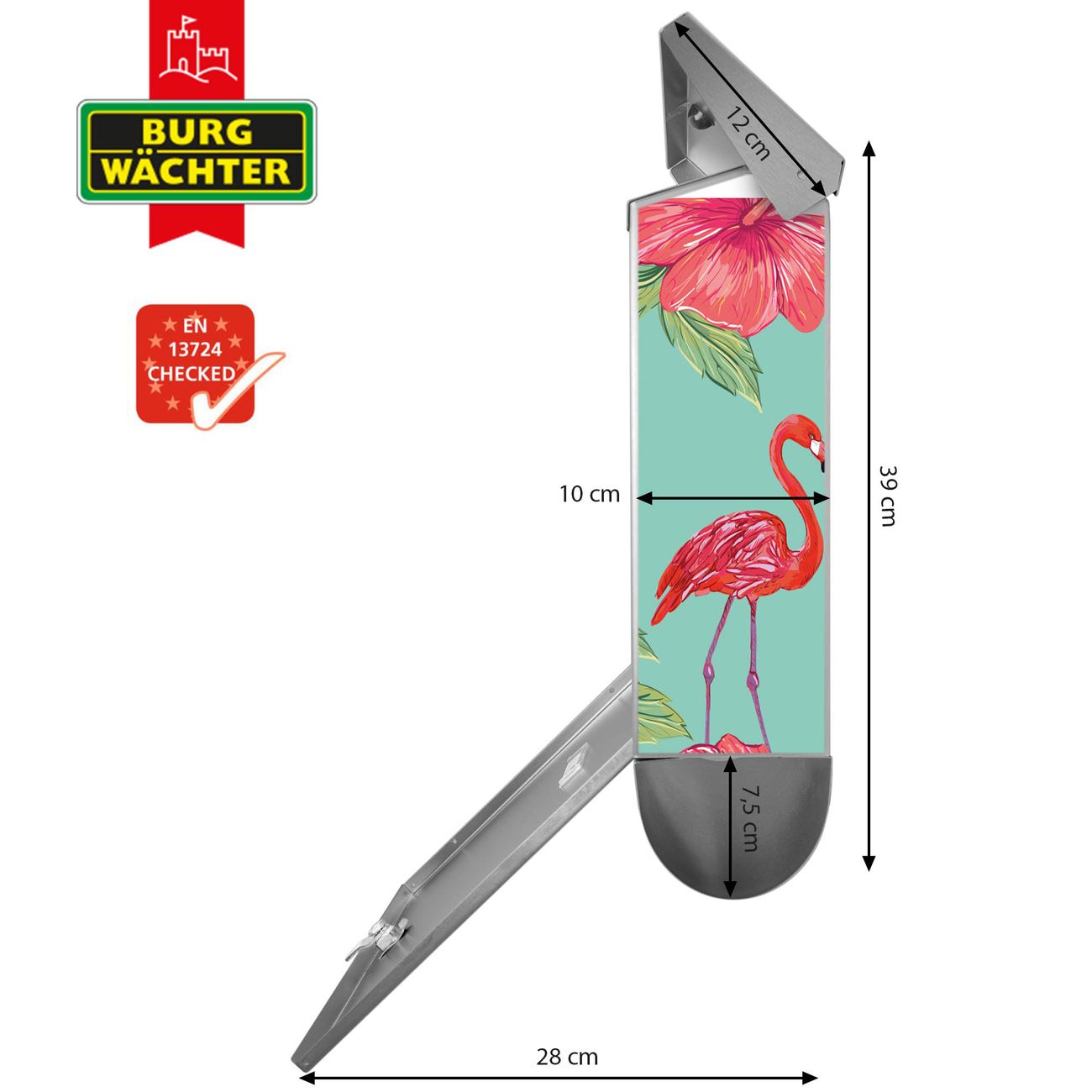 Der BURG-WÄCHTER Edelstahl Briefkasten mit Motiv Flamingo Liebe und Zeitungsrolle bietet Ihnen mit seinem Fassungsvermögen genügend Platz auch für große A4 Sendungen und Zeitschriften. Das integrierte Regendach schützt Ihre Post vor dem Eindringen von Regen.