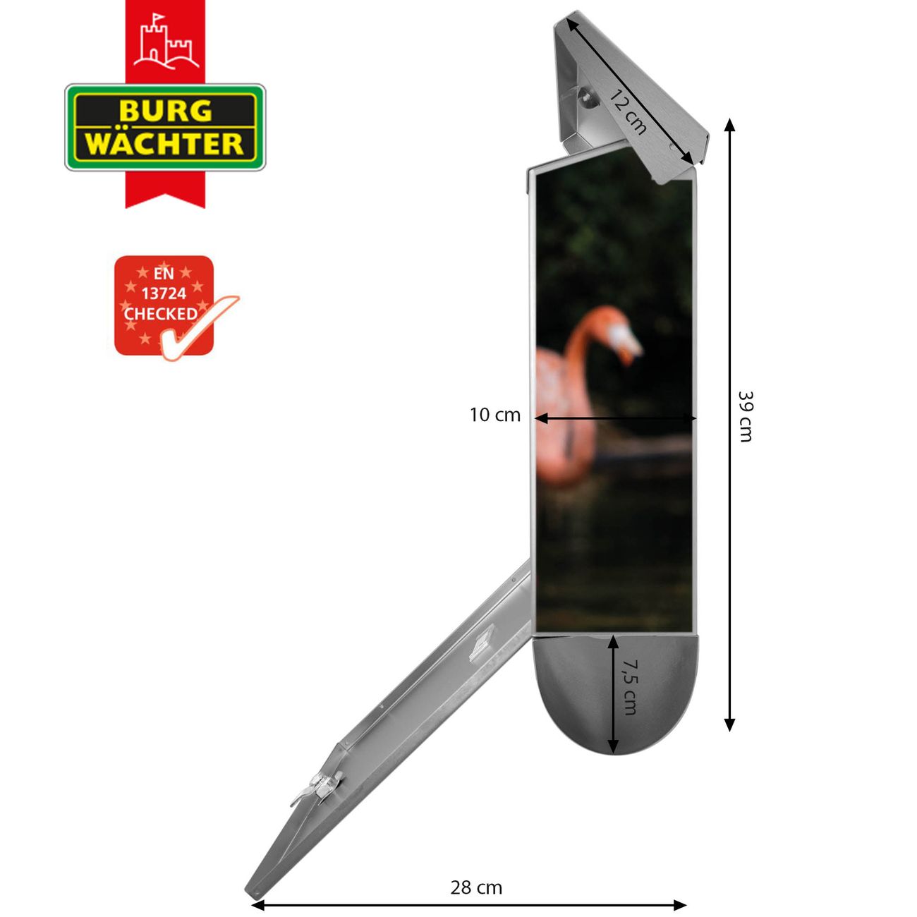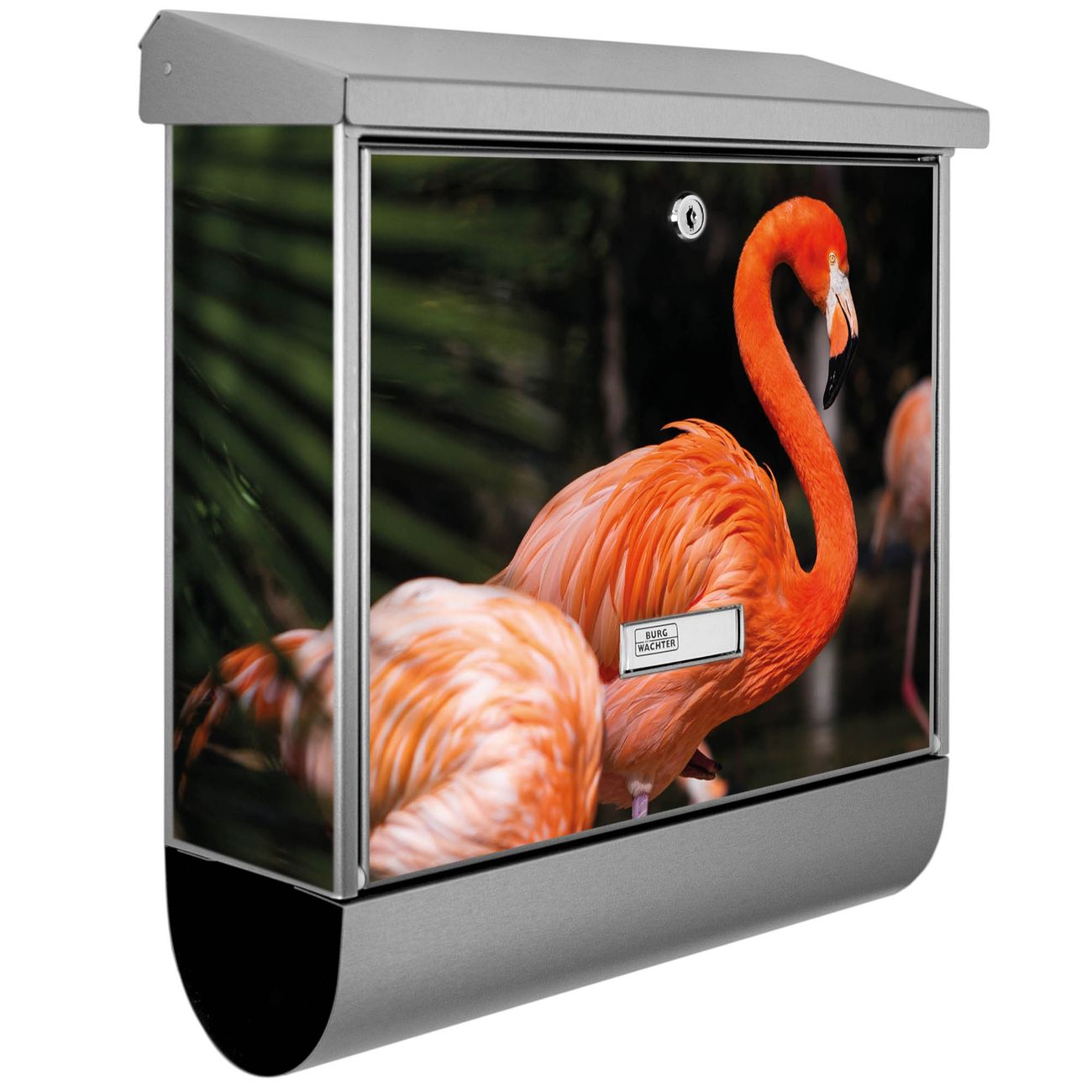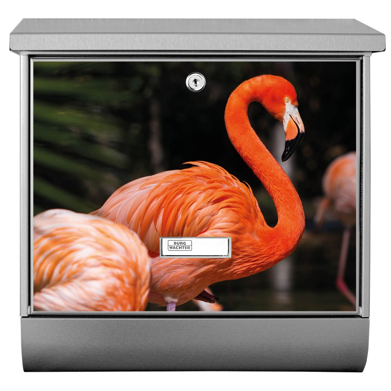 Der BURG-WÄCHTER Edelstahl Briefkasten mit Motiv Flamingo und Zeitungsrolle bietet Ihnen mit seinem Fassungsvermögen genügend Platz auch für große A4 Sendungen und Zeitschriften. Das integrierte Regendach schützt Ihre Post vor dem Eindringen von Regen.