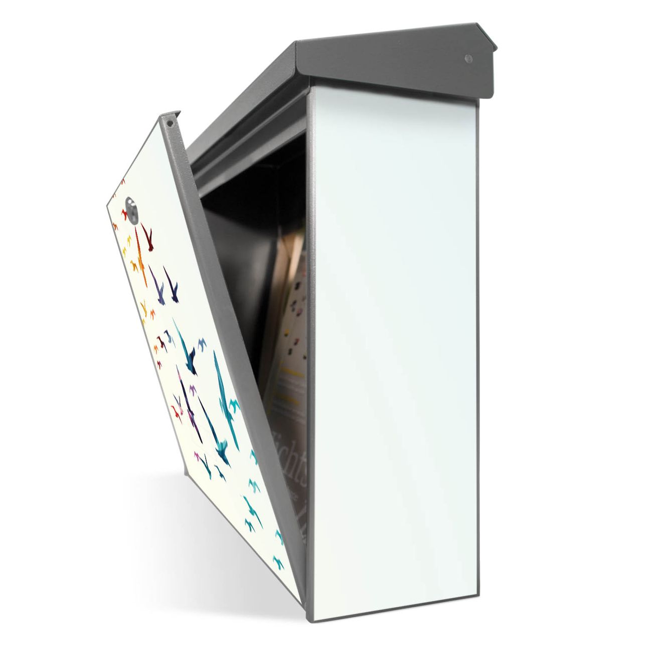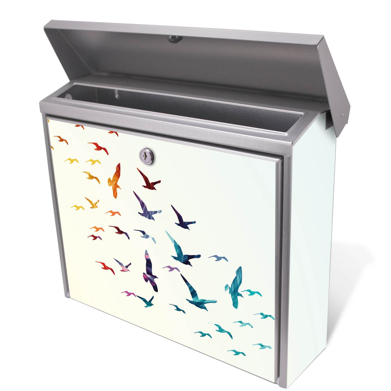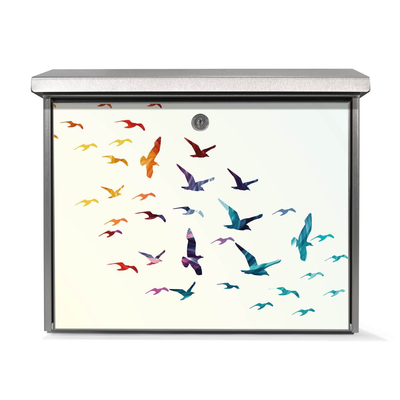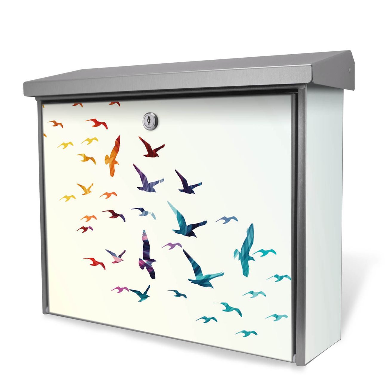 Der Postkasten mit Fliegende Vögel Motiv hat ein sehr ansprechendes und zeitloses Design. Unsere Motivpalette hält jede Menge Varianten bereit, ob klassisch, modern, verspielt oder witzig - für jeden haben wir das passende Motiv parat. Der Briefkasten ist das Aushängeschild Ihres Hauses.
