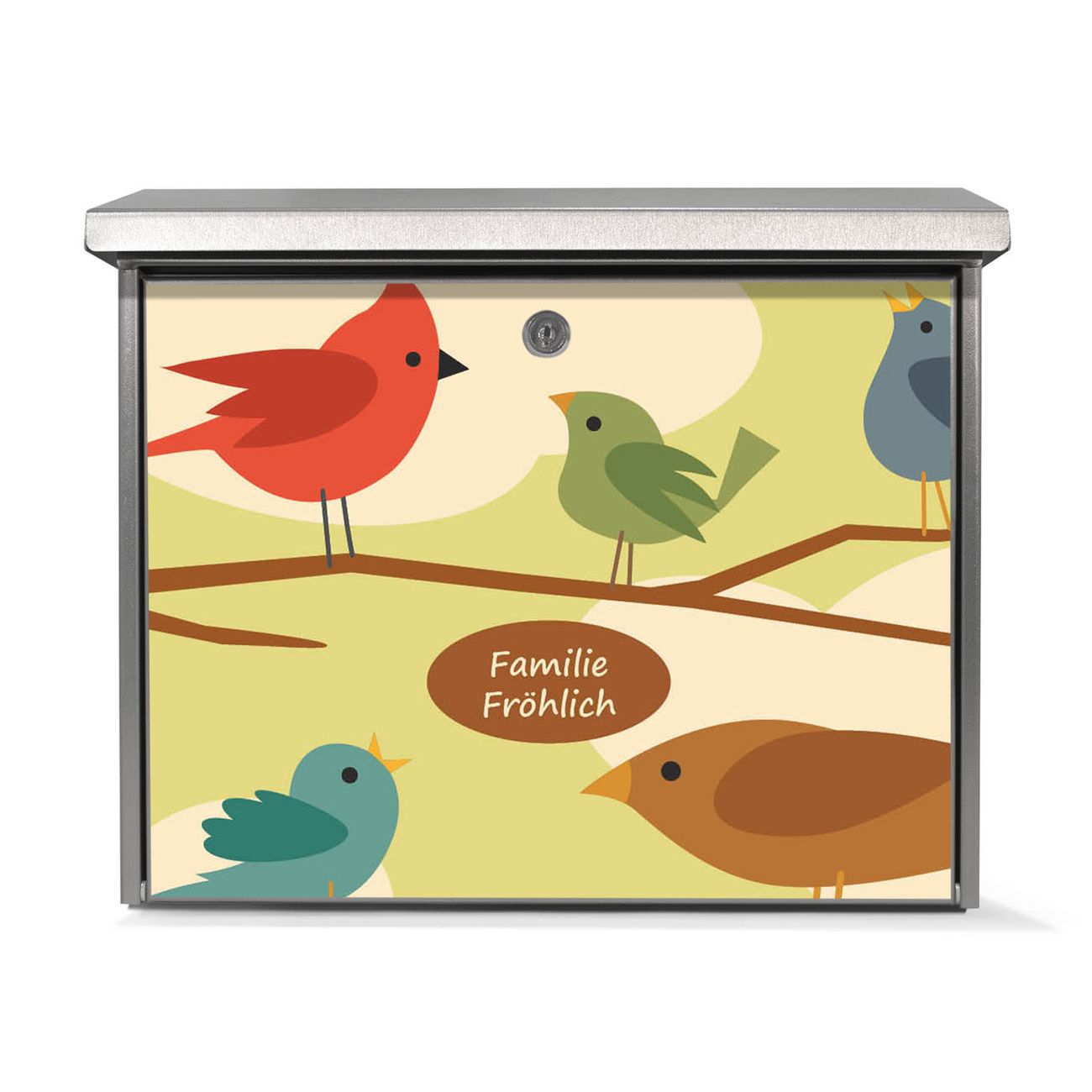 Der Postkasten mit Fünf Vögel Motiv hat ein sehr ansprechendes und zeitloses Design. Unsere Motivpalette hält jede Menge Varianten bereit, ob klassisch, modern, verspielt oder witzig - für jeden haben wir das passende Motiv parat. Der Briefkasten ist das Aushängeschild Ihres Hauses.