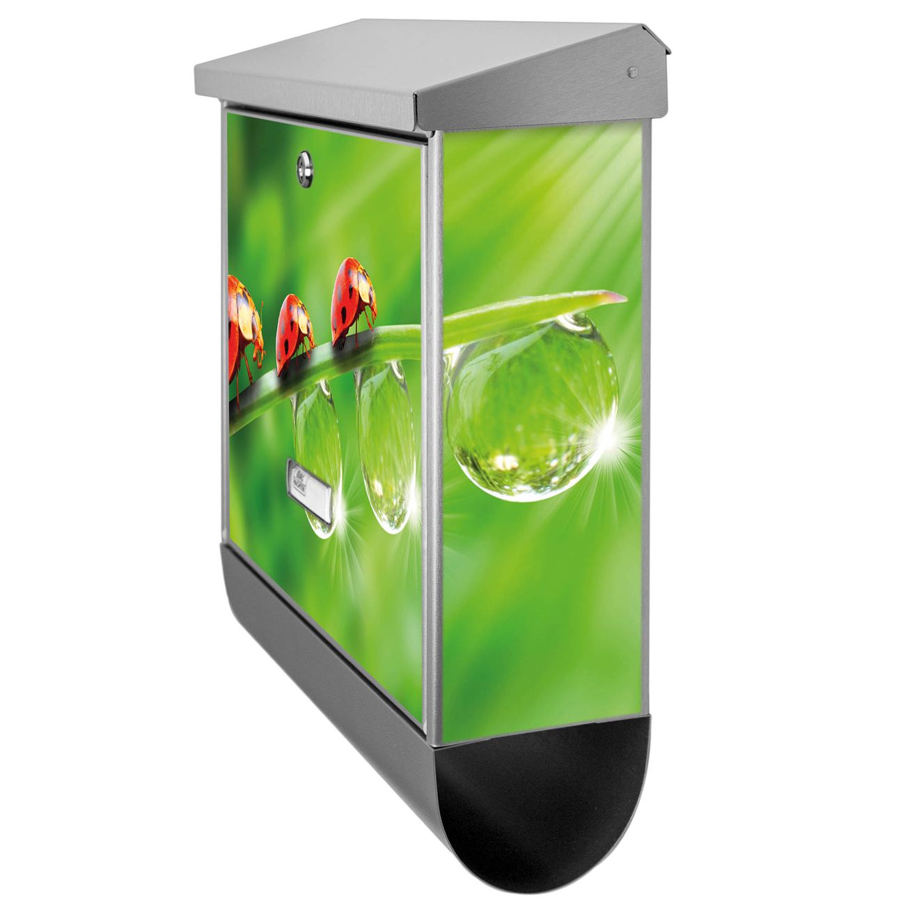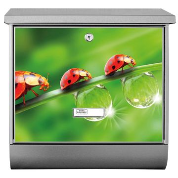 Der Briefkasten besteht aus Edelstahl, einem hochwertigen Material das rostfrei und äußerst unempfindlich gegenüber Witterungseinflüssen ist. Das Motiv besteht aus einer wetter- und UV-festen Folie, die Ihren Briefkasten zusätzlich vor Kratzern schützt. Der Postkasten ist je nach Auswahl 38 x 39 x 12 CM oder 38 x 31,5 x 12 cm (BxHxT) groß. Der Briefeinwurf ist 33,2cm x 3,1cm, Format DIN C4. Der Briefkasten wird mit Montagematerial und zwei Schlüsseln geliefert.
