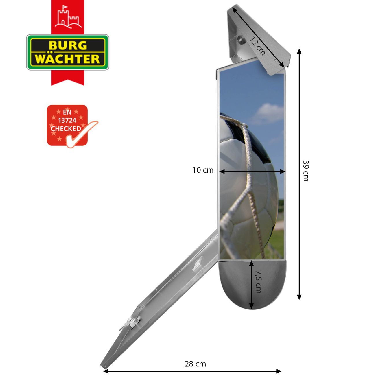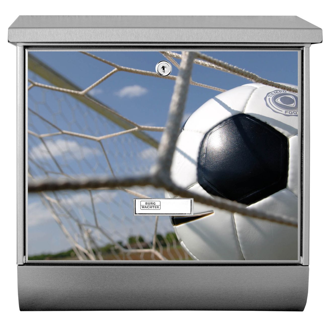 Der BURG-WÄCHTER Edelstahl Briefkasten mit Motiv Fußball und Zeitungsrolle bietet Ihnen mit seinem Fassungsvermögen genügend Platz auch für große A4 Sendungen und Zeitschriften. Das integrierte Regendach schützt Ihre Post vor dem Eindringen von Regen.