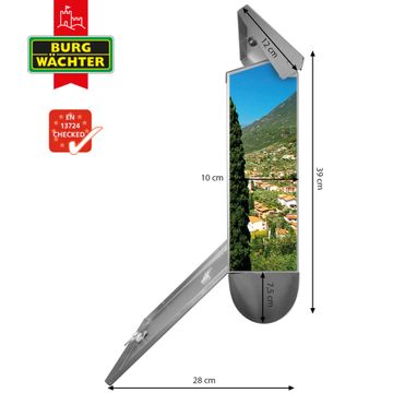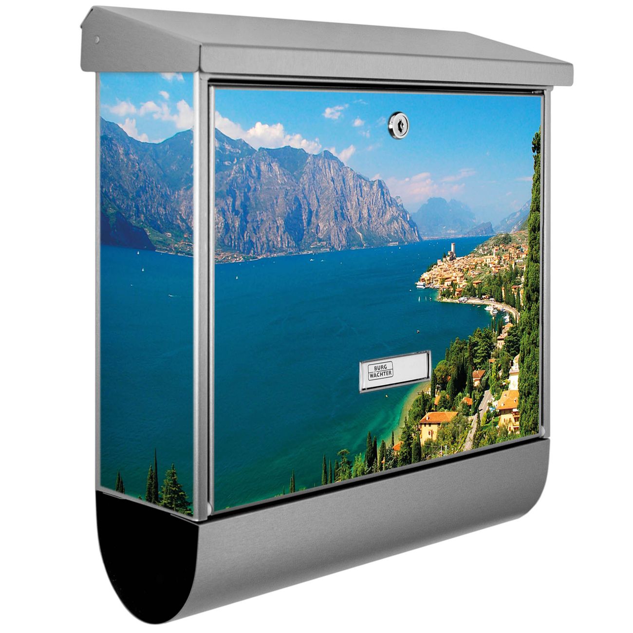 Der BURG-WÄCHTER Edelstahl Briefkasten mit Motiv Gardasee und Zeitungsrolle bietet Ihnen mit seinem Fassungsvermögen genügend Platz auch für große A4 Sendungen und Zeitschriften. Das integrierte Regendach schützt Ihre Post vor dem Eindringen von Regen.