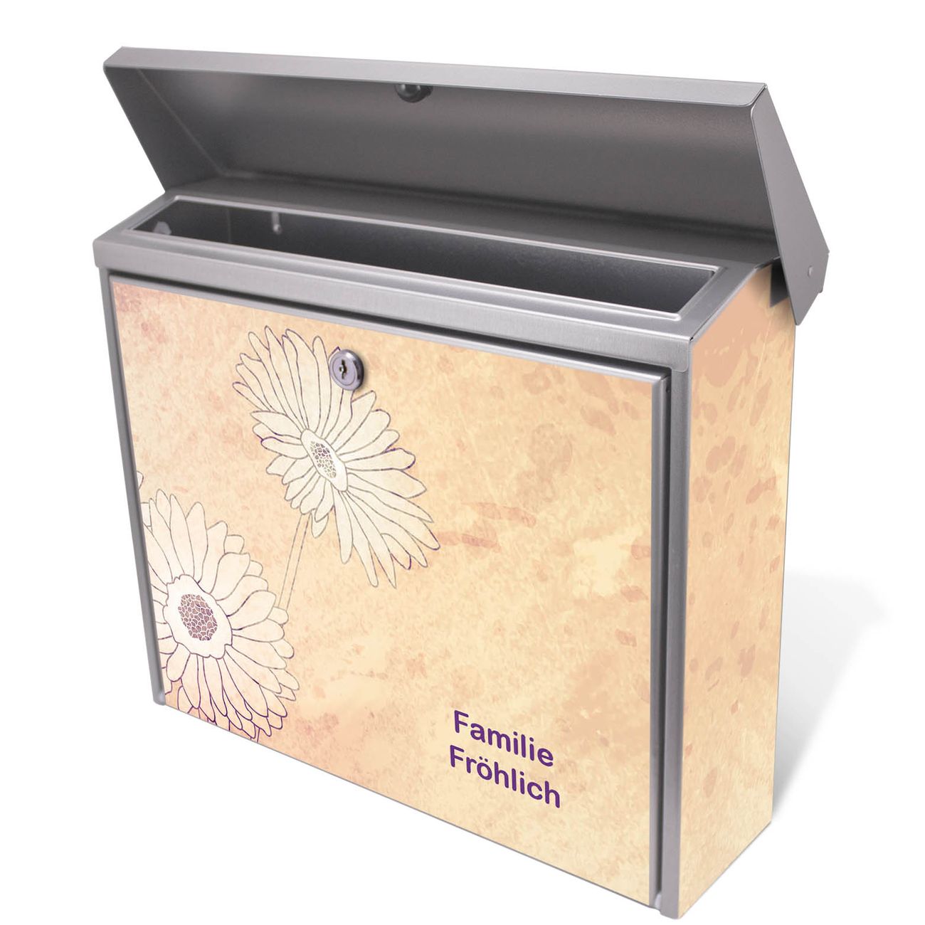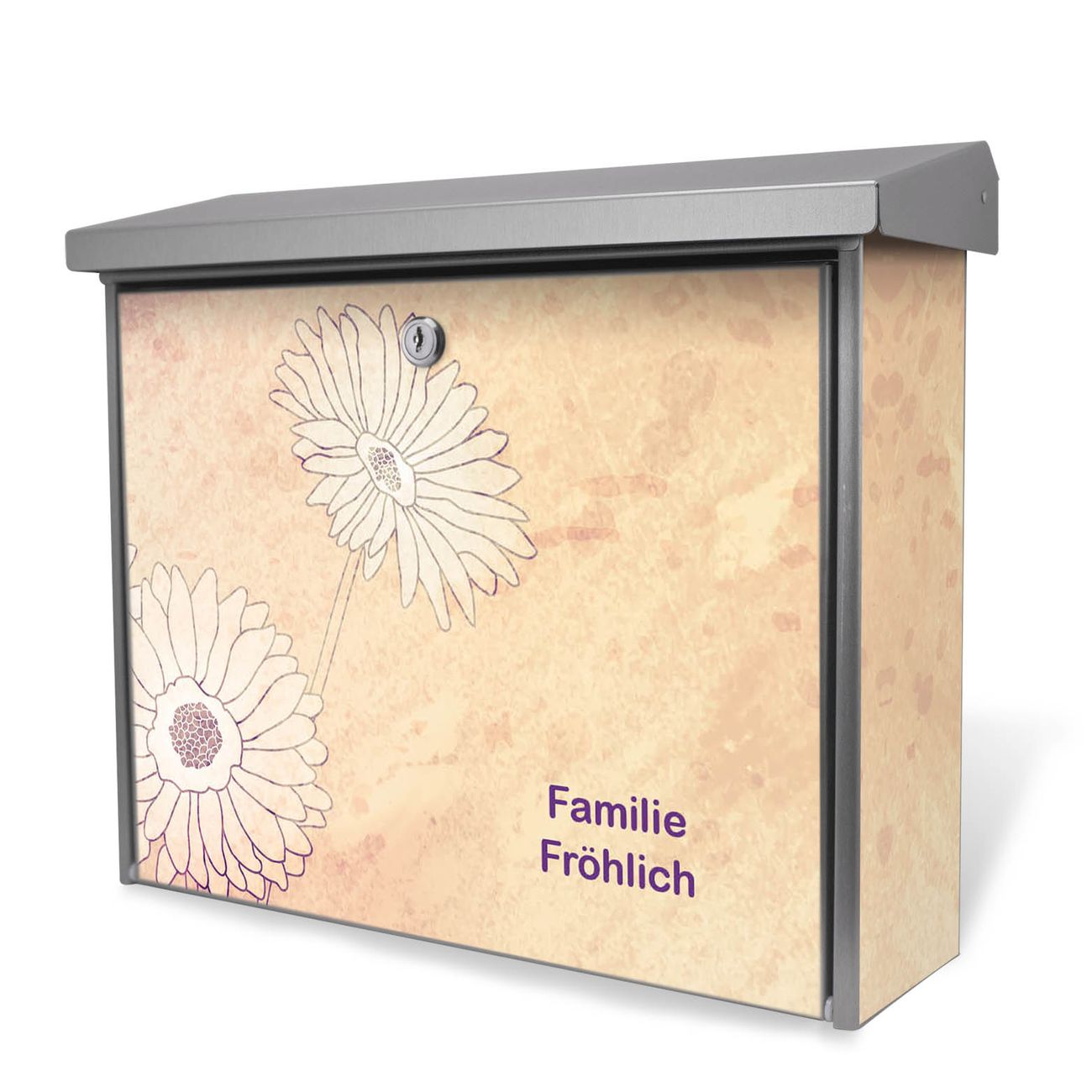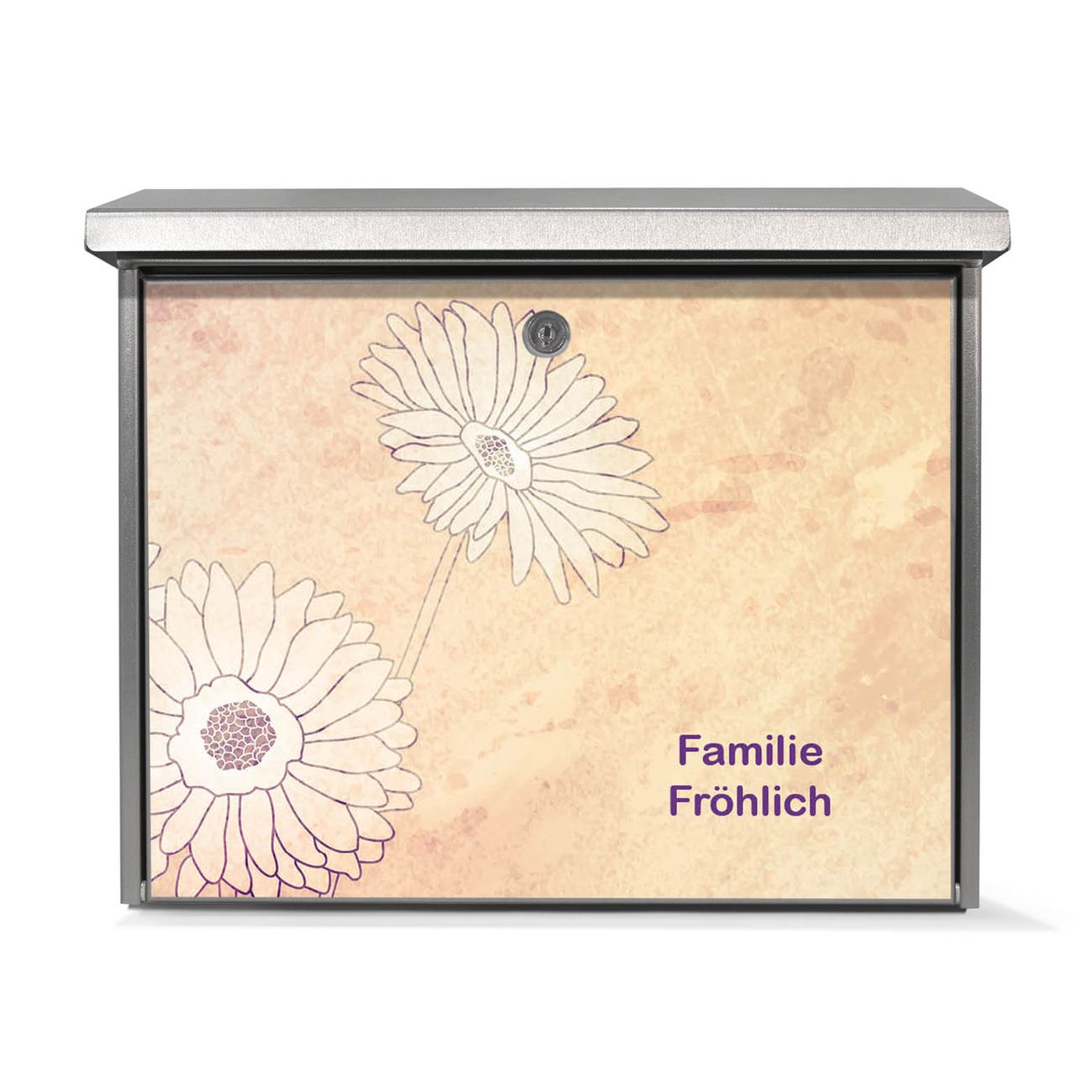 Der Postkasten mit Gerbera Motiv hat ein sehr ansprechendes und zeitloses Design. Unsere Motivpalette hält jede Menge Varianten bereit, ob klassisch, modern, verspielt oder witzig - für jeden haben wir das passende Motiv parat. Der Briefkasten ist das Aushängeschild Ihres Hauses.