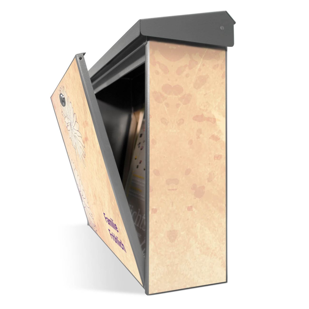 Der Briefkasten besteht aus Edelstahl, einem hochwertigen Material das witterungsbeständig ist. Das Motiv besteht aus einer wetter- und UV-festen Folie, die Ihren Briefkasten zusätzlich vor Kratzern schützt. Der Postkasten ist 31,5cm hoch, 38,5cm breit und 12cm tief. Der Briefeinwurf ist 33,2cm x 2,7cm, Format DIN C4. Der Briefkasten wird mit Montagematerial und zwei Schlüsseln geliefert.