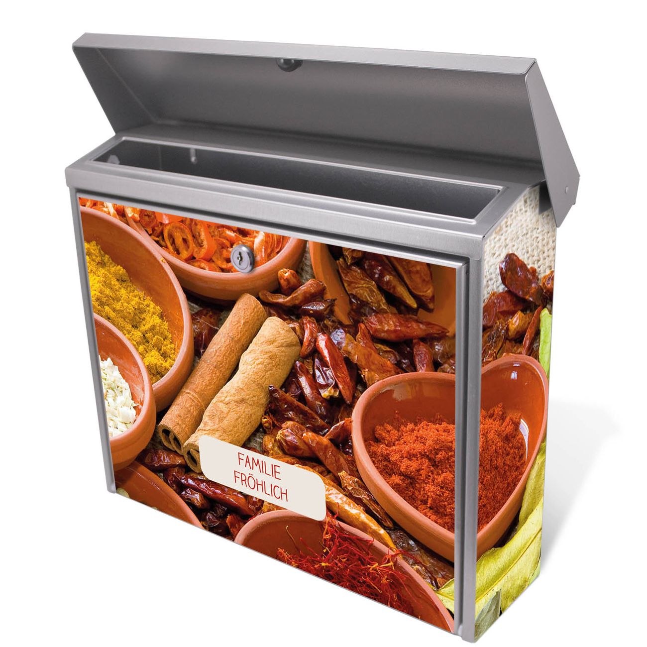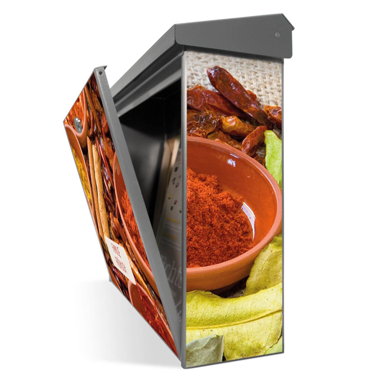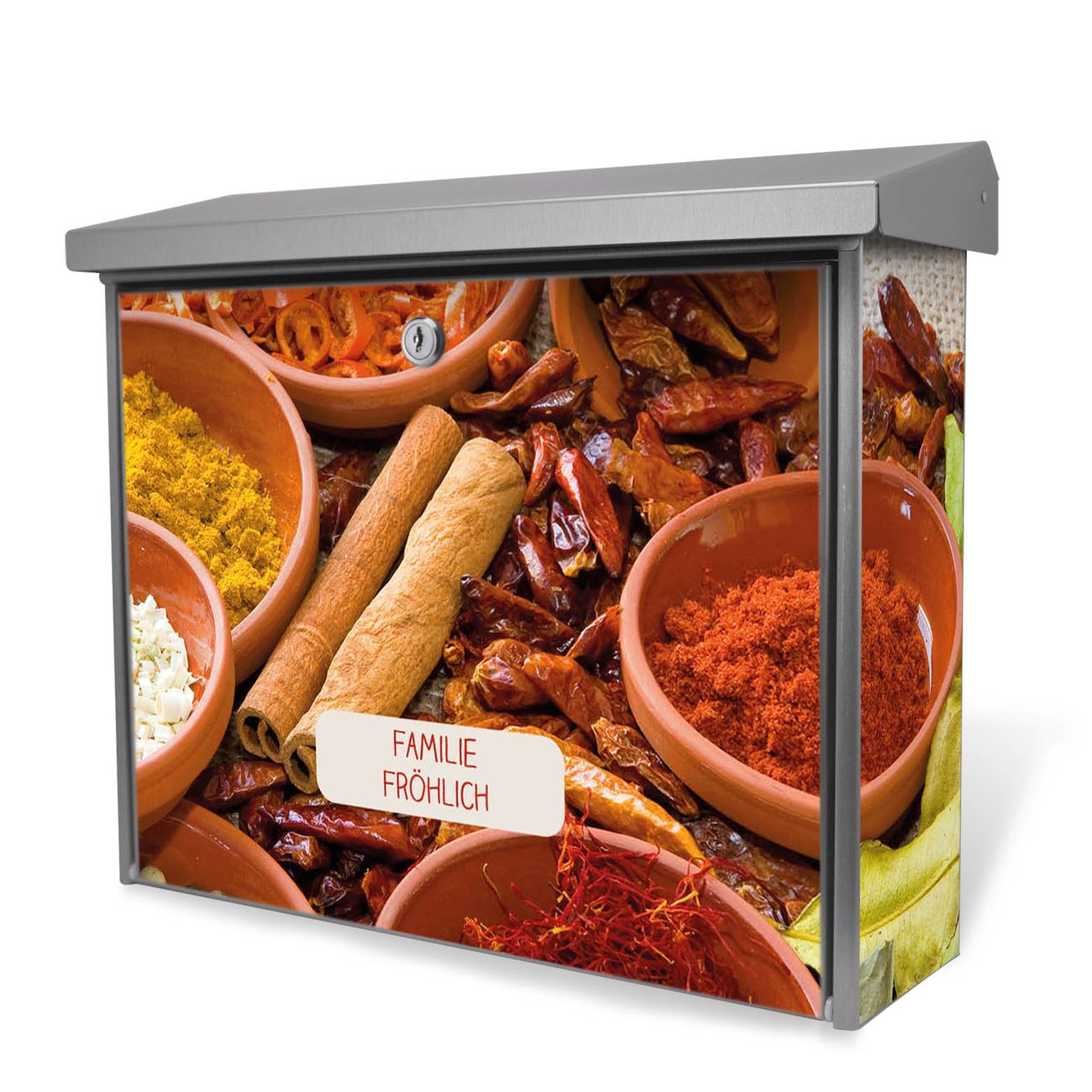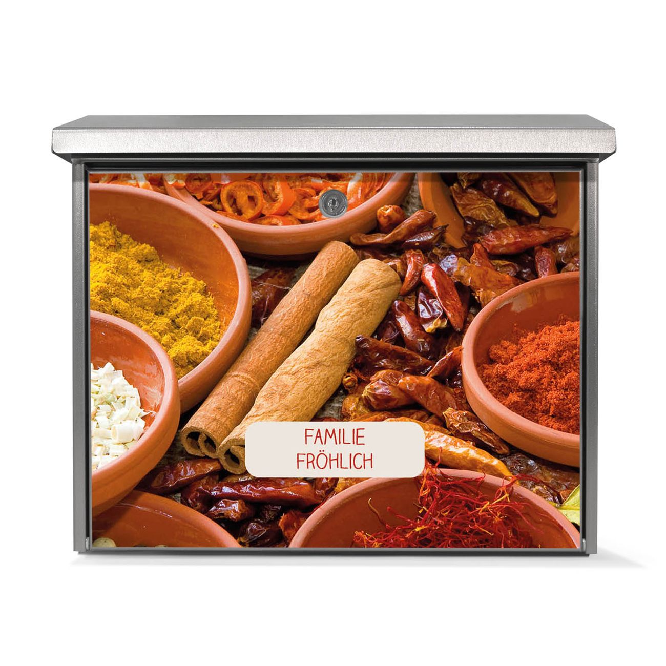 Der Postkasten mit Gewürze Motiv hat ein sehr ansprechendes und zeitloses Design. Unsere Motivpalette hält jede Menge Varianten bereit, ob klassisch, modern, verspielt oder witzig - für jeden haben wir das passende Motiv parat. Der Briefkasten ist das Aushängeschild Ihres Hauses.