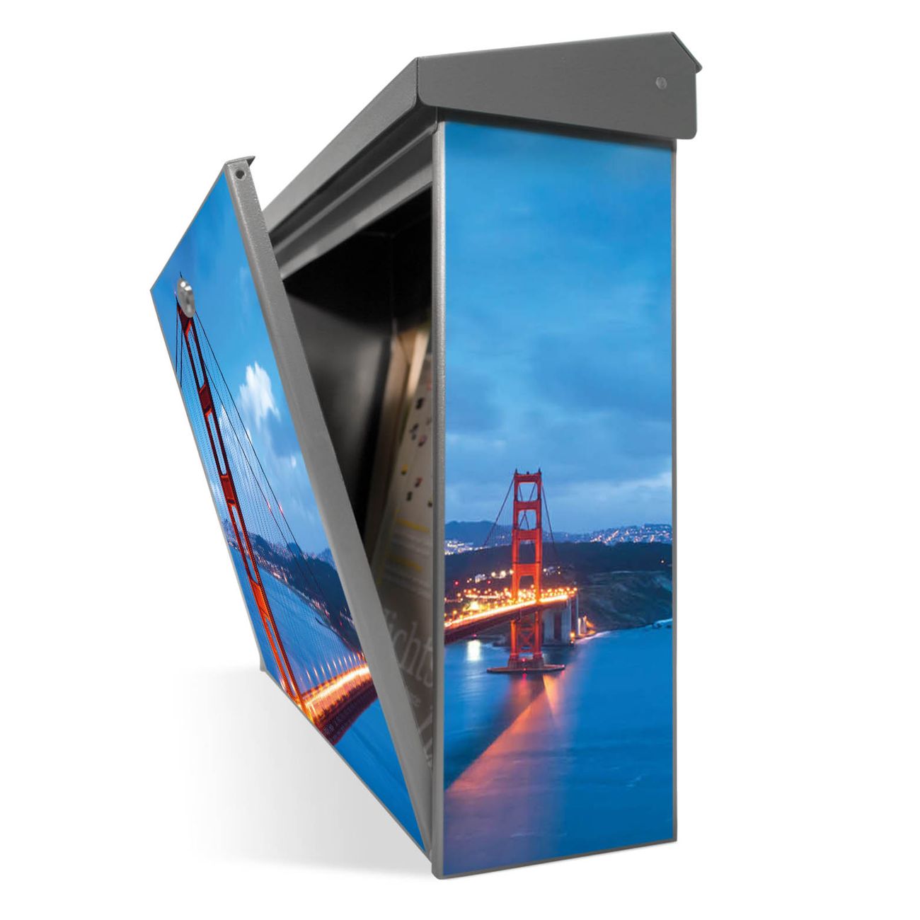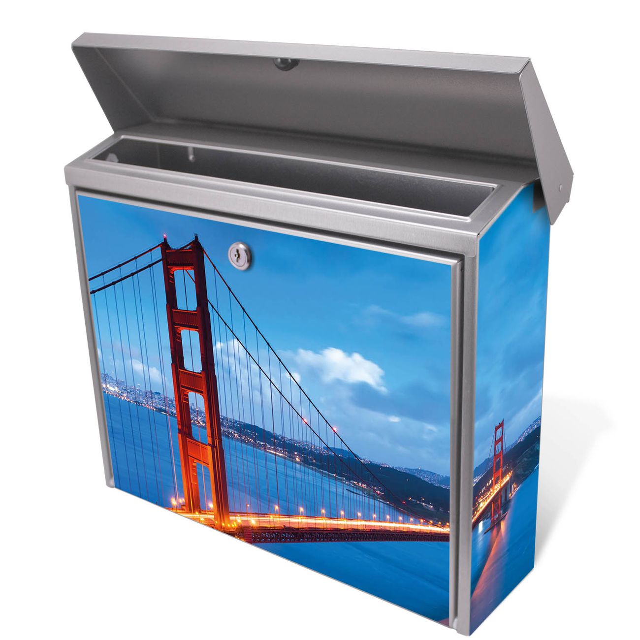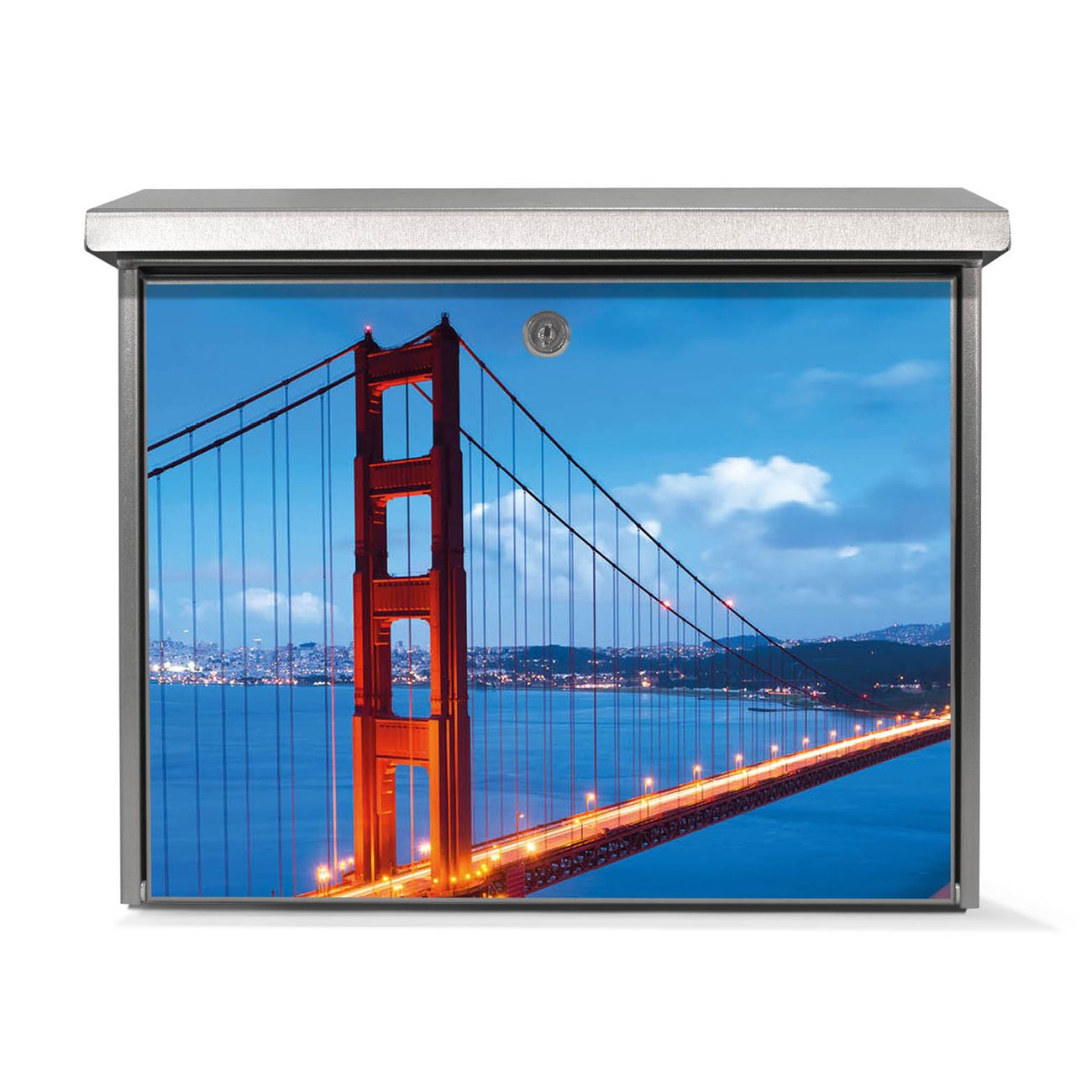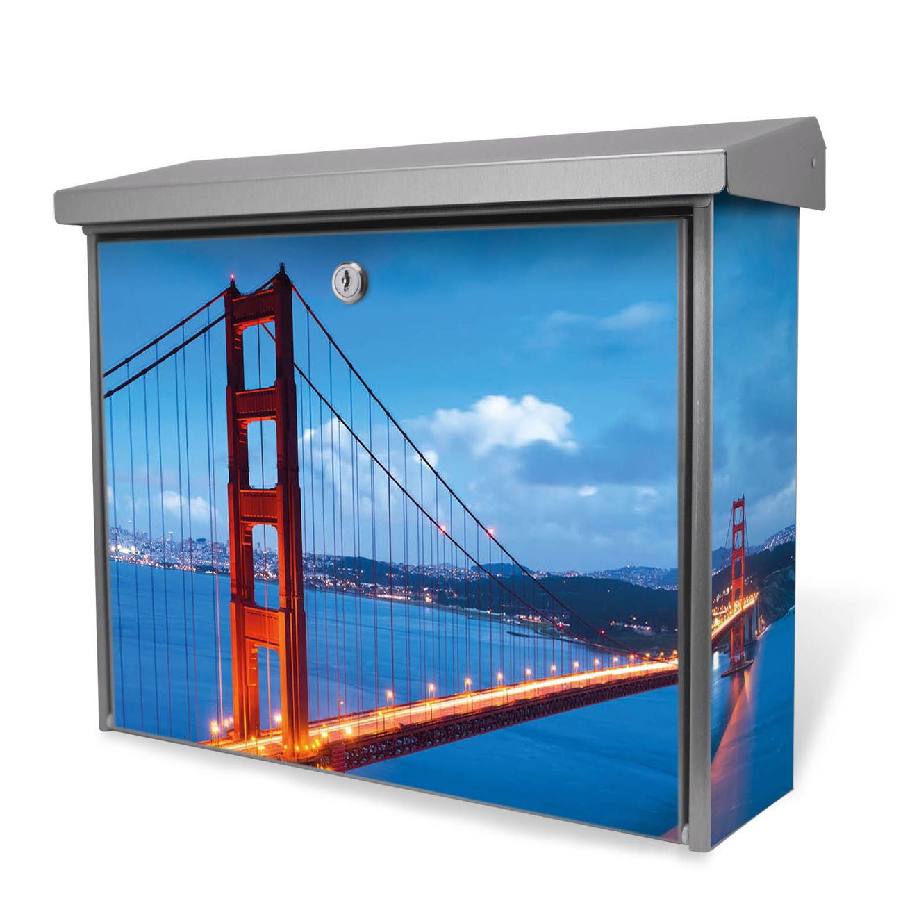 Der Postkasten mit Golden Gate Bridge Motiv hat ein sehr ansprechendes und zeitloses Design. Unsere Motivpalette hält jede Menge Varianten bereit, ob klassisch, modern, verspielt oder witzig - für jeden haben wir das passende Motiv parat. Der Briefkasten ist das Aushängeschild Ihres Hauses.