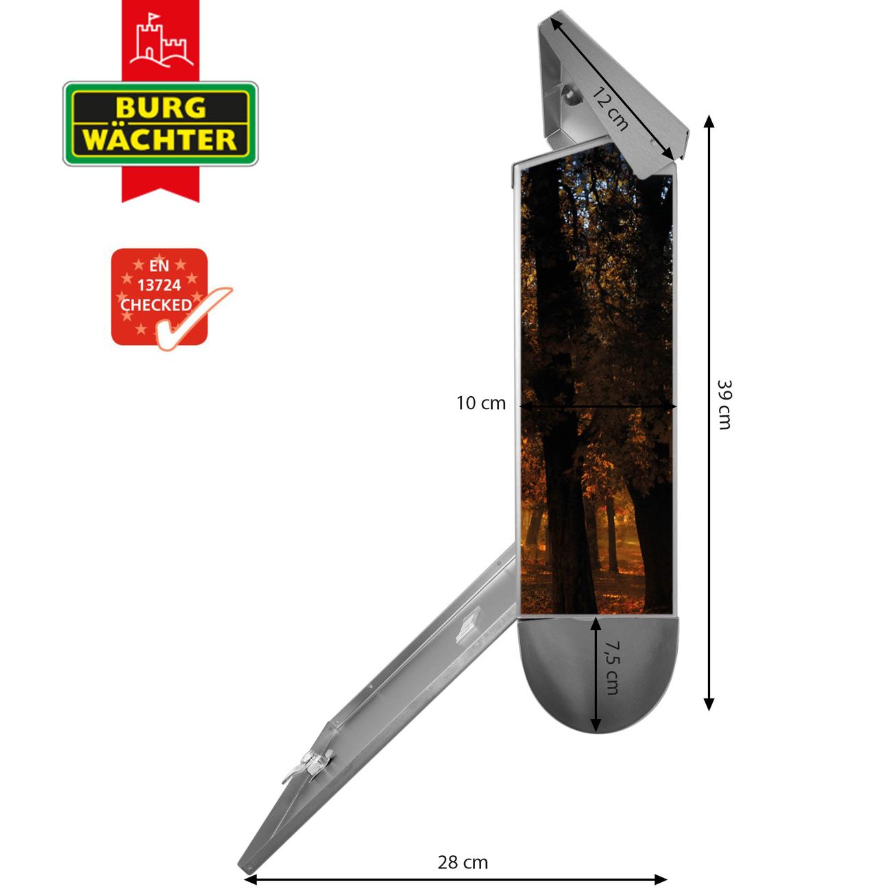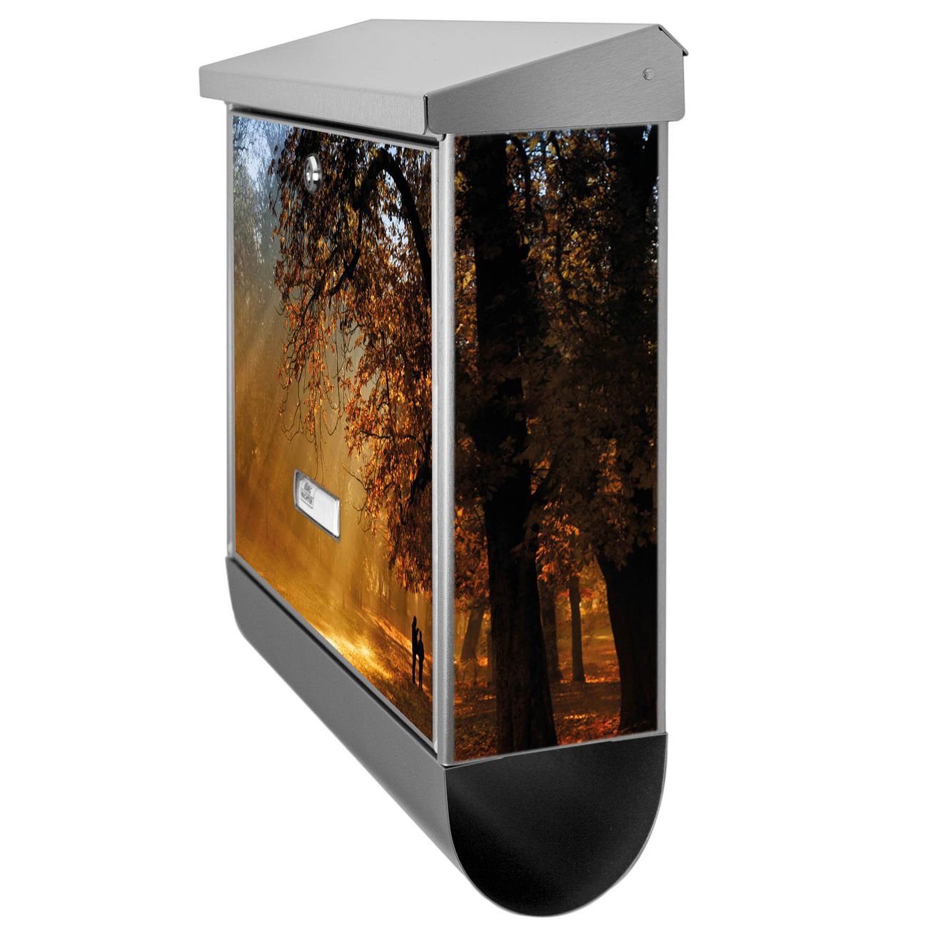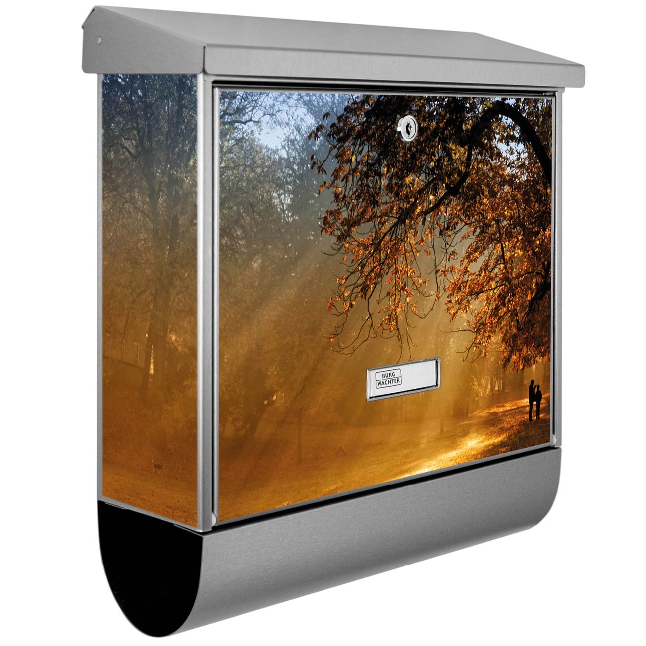 Der BURG-WÄCHTER Edelstahl Briefkasten mit Motiv Goldener Herbst und Zeitungsrolle bietet Ihnen mit seinem Fassungsvermögen genügend Platz auch für große A4 Sendungen und Zeitschriften. Das integrierte Regendach schützt Ihre Post vor dem Eindringen von Regen.