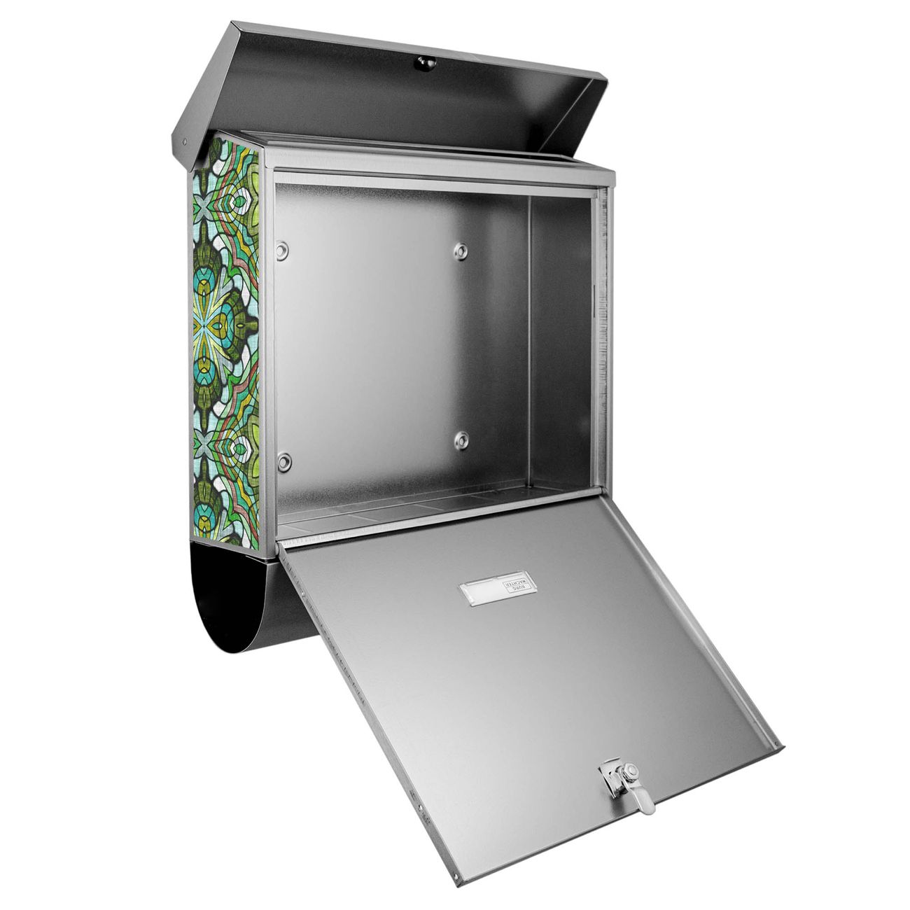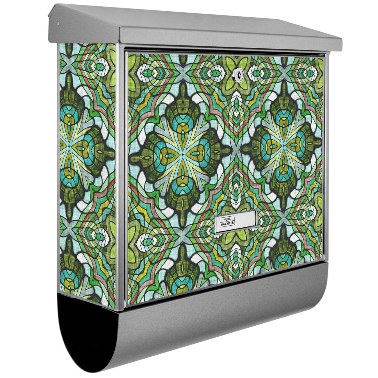 Der BURG-WÄCHTER Edelstahl Briefkasten mit Motiv Grünes Muster und Zeitungsrolle bietet Ihnen mit seinem Fassungsvermögen genügend Platz auch für große A4 Sendungen und Zeitschriften. Das integrierte Regendach schützt Ihre Post vor dem Eindringen von Regen.