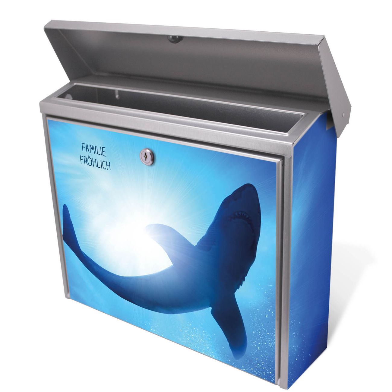 Der Postkasten mit Hai Motiv hat ein sehr ansprechendes und zeitloses Design. Unsere Motivpalette hält jede Menge Varianten bereit, ob klassisch, modern, verspielt oder witzig - für jeden haben wir das passende Motiv parat. Der Briefkasten ist das Aushängeschild Ihres Hauses.