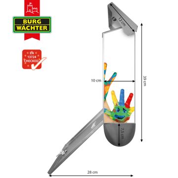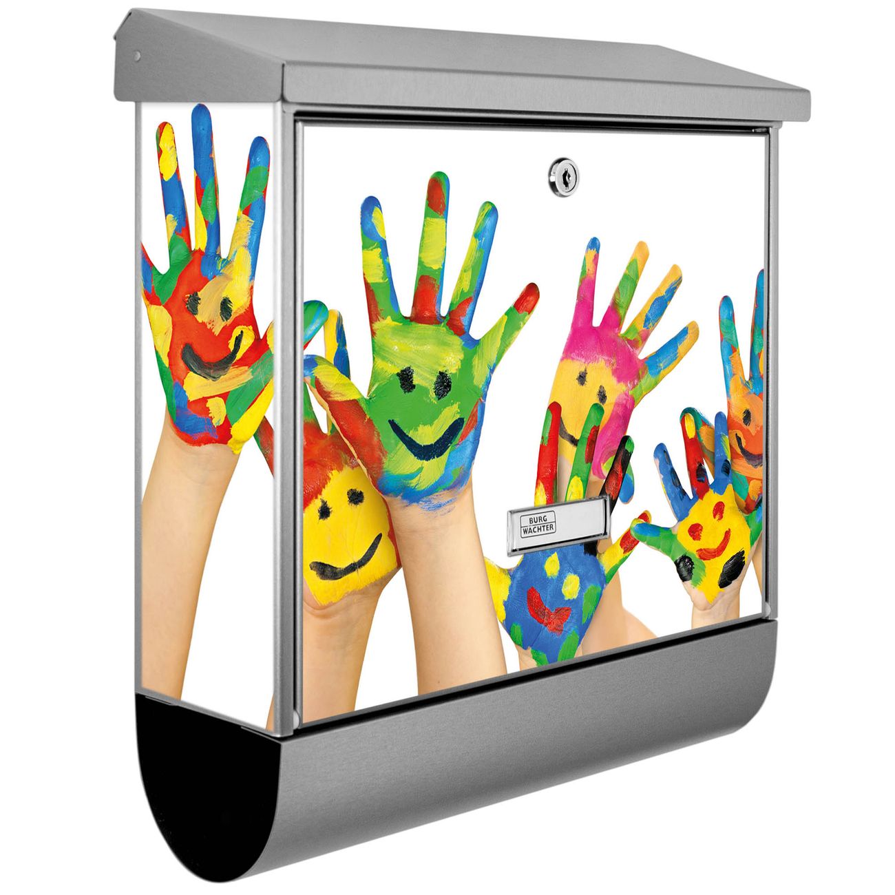 Der BURG-WÄCHTER Edelstahl Briefkasten mit Motiv Happy Hands und Zeitungsrolle bietet Ihnen mit seinem Fassungsvermögen genügend Platz auch für große A4 Sendungen und Zeitschriften. Das integrierte Regendach schützt Ihre Post vor dem Eindringen von Regen.